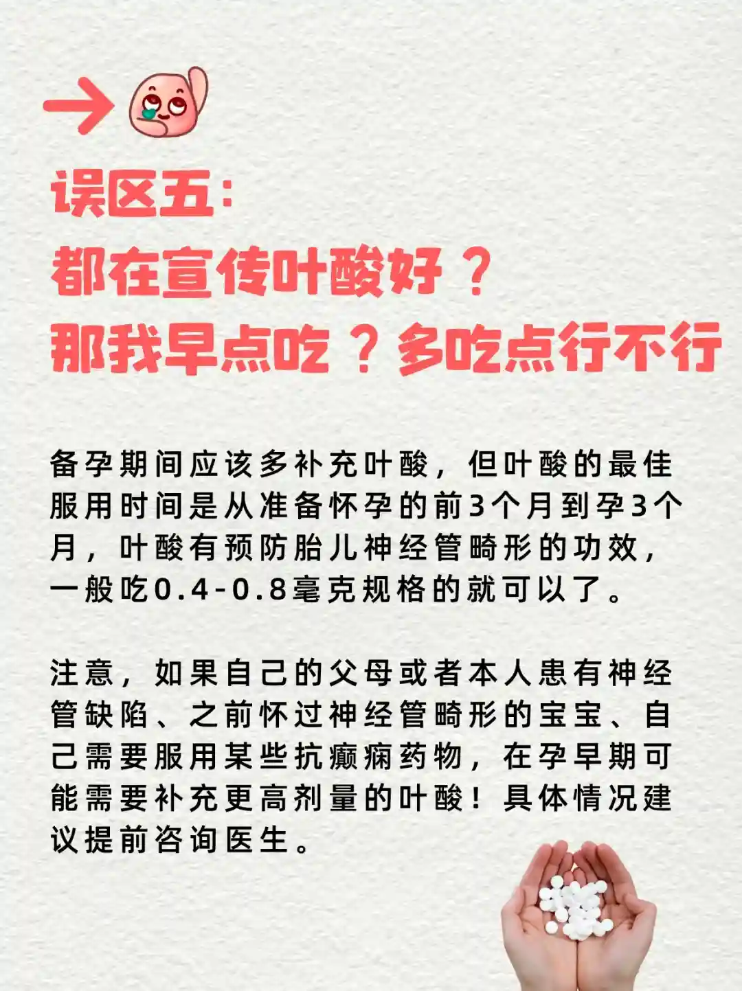 5⃣️误区五:都在宣传叶酸好?那我早点吃?多吃点行不行?