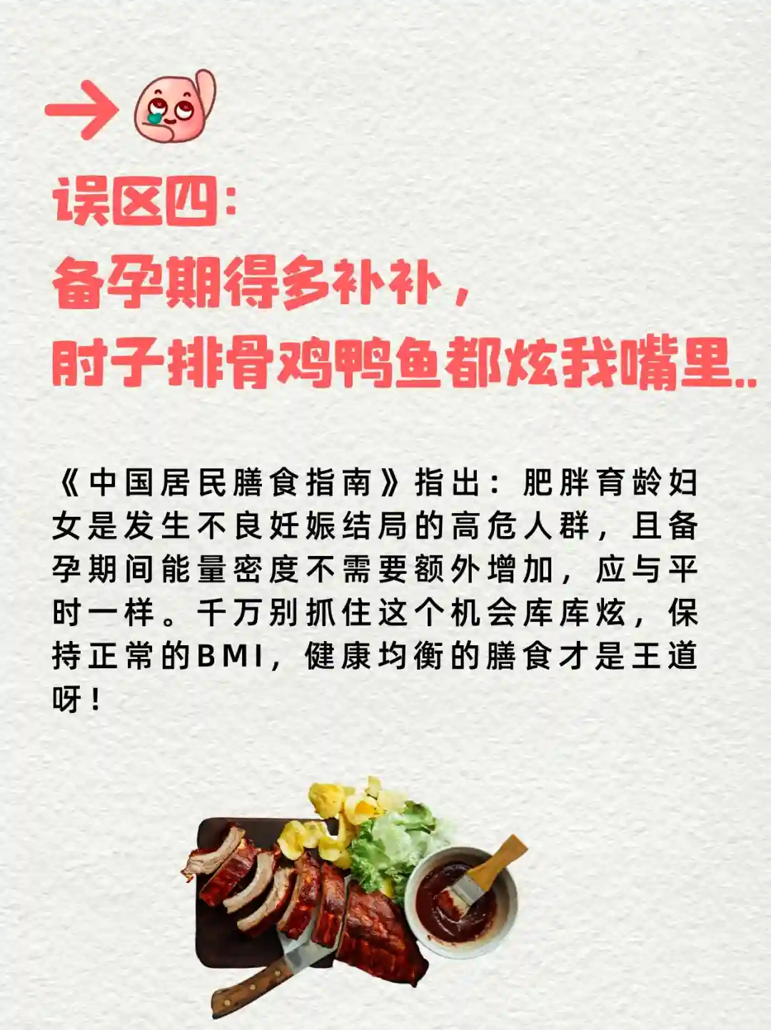 4⃣️误区四:备孕期得多补补,肘子排骨鸡鸭鱼都炫我嘴里..