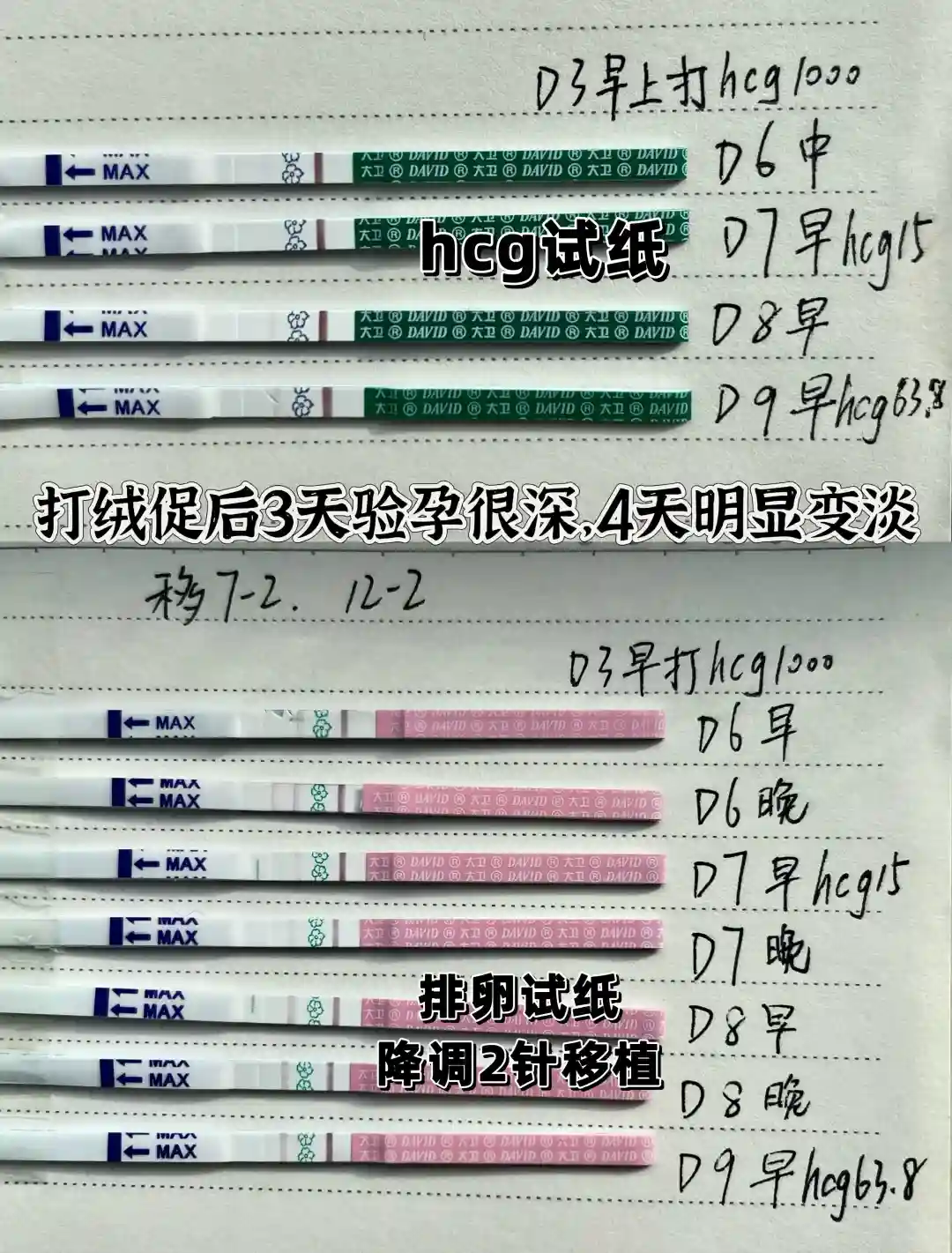 图④关于绒促hcg1000几天代谢完,网上说72小时,我三天肯定没有代谢完,hcg还有10左右,估计四天还有5,我第六天验孕棒和排卵试纸都很深,第七天变浅了,幸亏后来加深了。