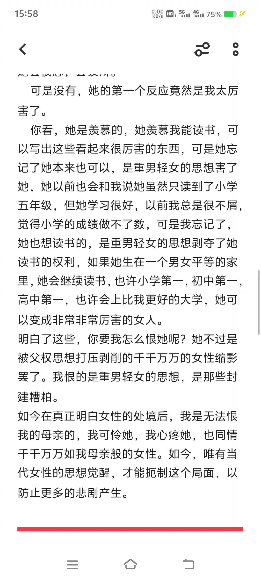 你看,她是羡慕的,她羡慕我能读书,可以写出这些看起来很厉害的东西,可是她忘记了她本来也可以是重男轻女的思想害了她,她以前和我说她虽然只读到了小学,但她学习很好,以前我总是不屑,觉得小学的成绩做不了数,可是我忘记了她也想读书的,是重男轻女的思想剥夺了她读书的权利,如果她生在一个男女平等的家里她会继续读书,也许小学中学第一也许会上比我更好的大学,她会有不一样的人生