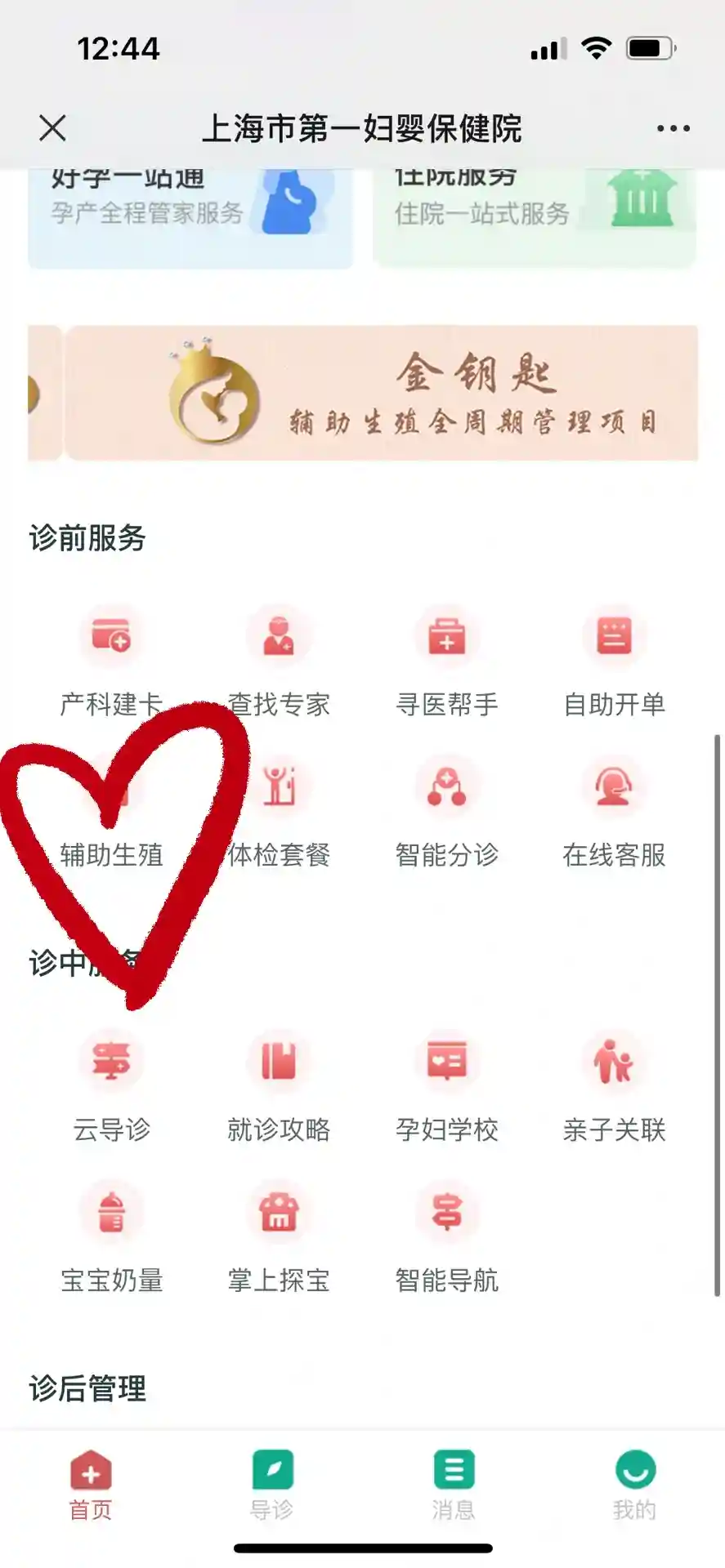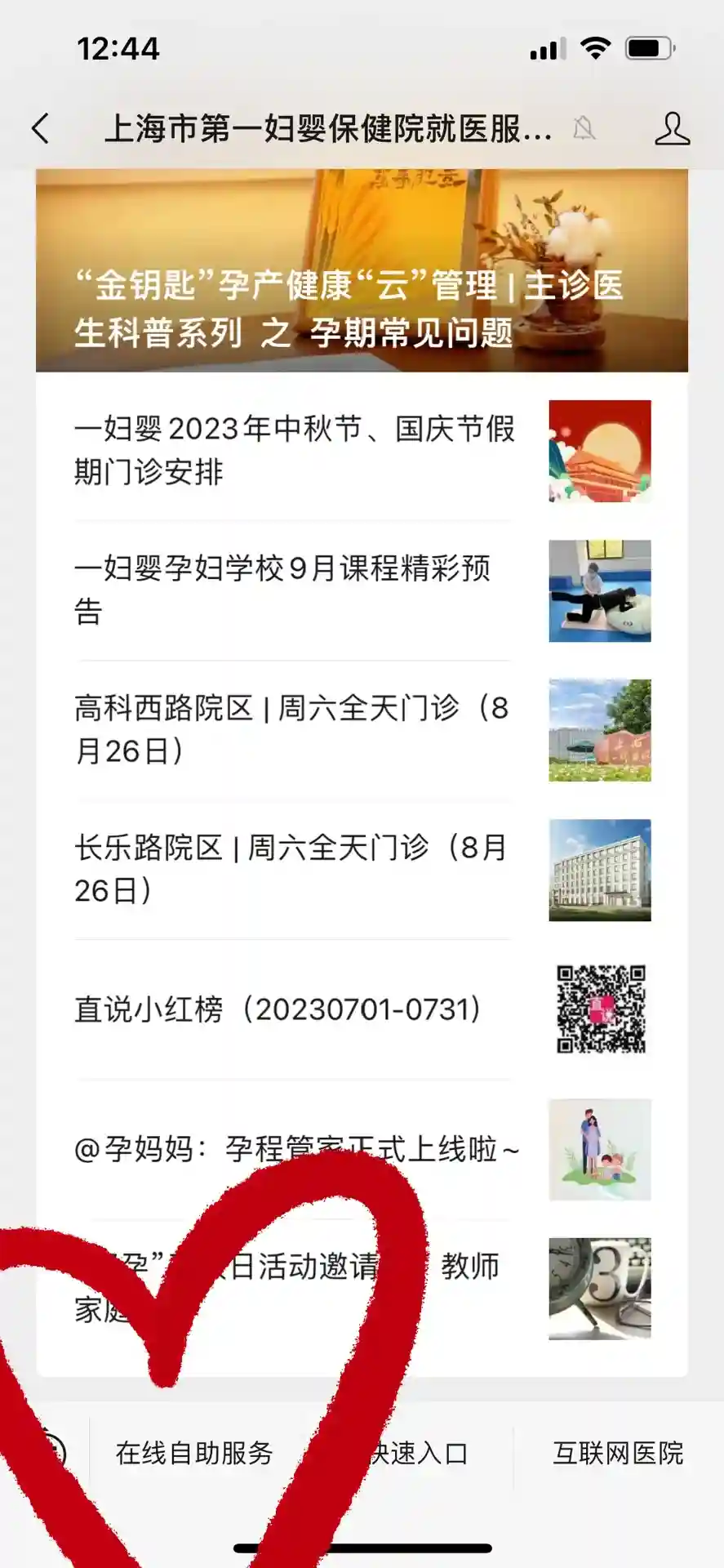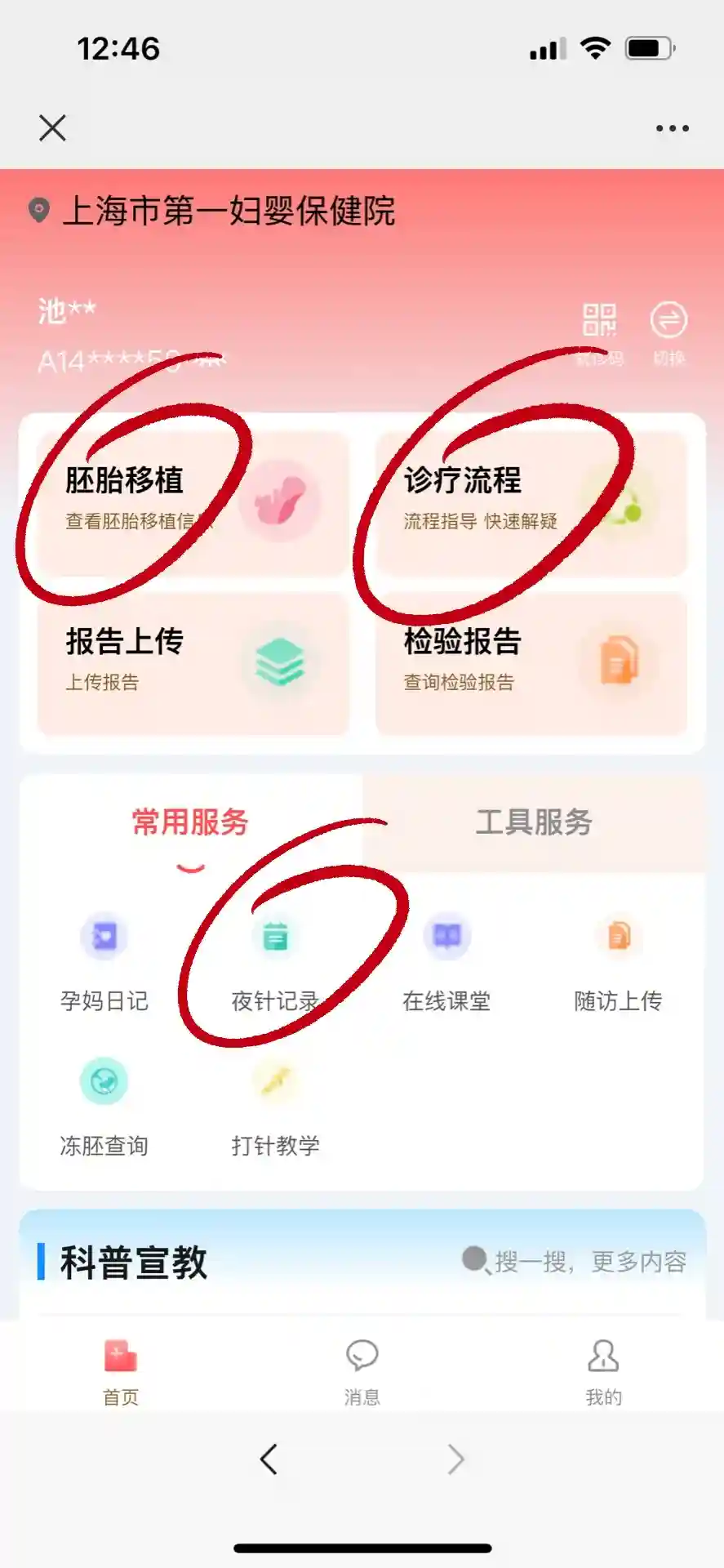 另外,现在在“上海市第一妇婴保健院就医服务号”公众号,“在线自助服务”里面,下拉有个“辅助生殖”模块,里面有很多科普宣教的信息,试管周期患者取卵前要上传夜针记录,大家也可以在“诊疗流程”里查询取卵周期冷冻的胚胎数目,在“胚胎移植”里查询移植当天的胚胎情况啦