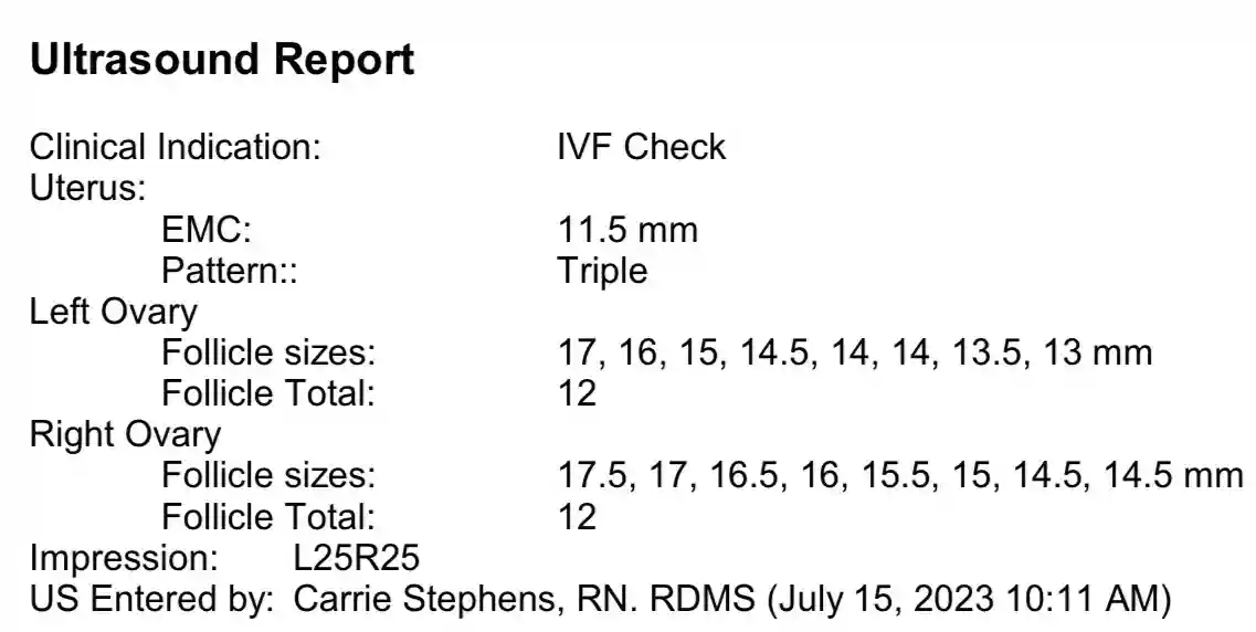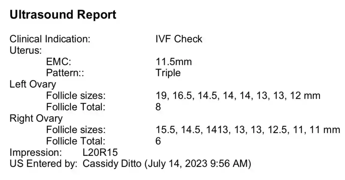 我前一天非常担心取消周期。这次做b超和老公一起。他坐旁边看着。b超护士确认我有35个卵泡。我惊呆🤯了!我不敢相信!护士再次确认。她说b超报告上卵泡大小只能填写左边右边各8个数字,所以b超报告上只显示最大的16个卵泡大小,但是我卵泡很多小的,一共35个卵泡。这也明白了为什么我E2数值突然猛增到快七千。除了肚子感觉有点胀,没有其他不适感觉。(图二)
