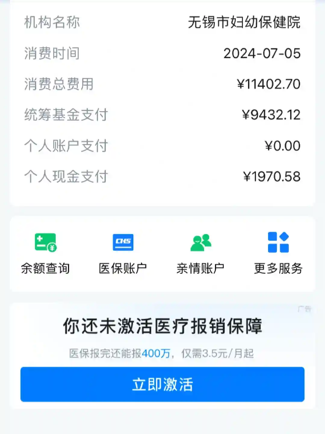1.消费11402.7元,统筹9432.12元,自费:1970.58元;