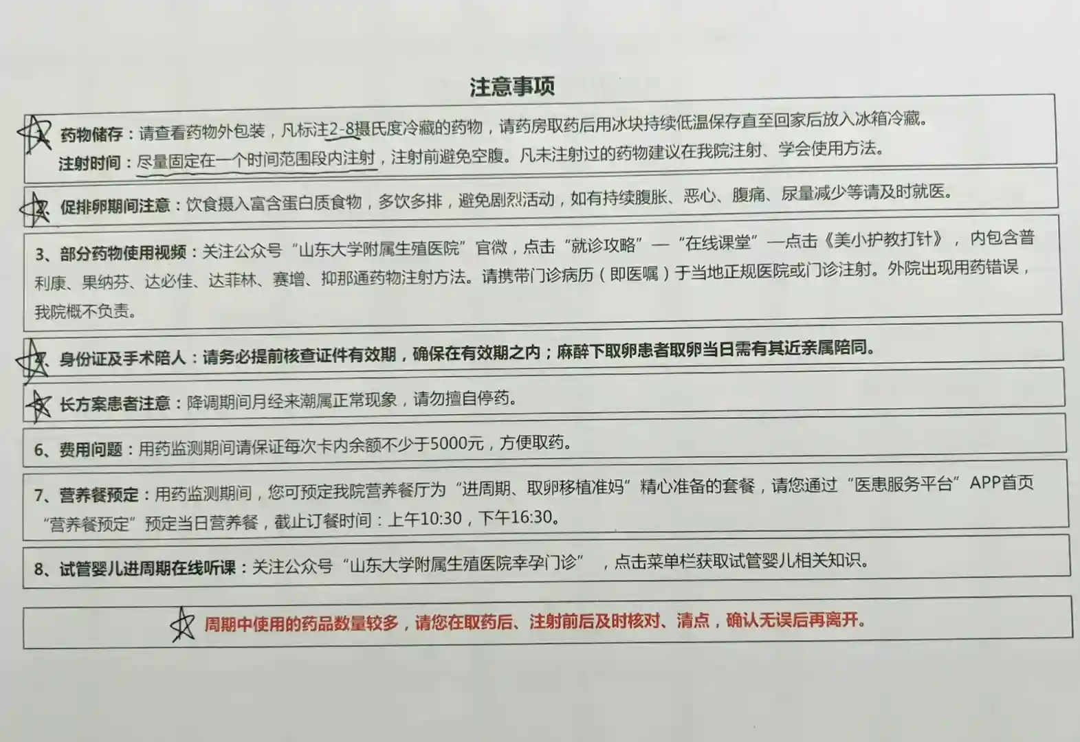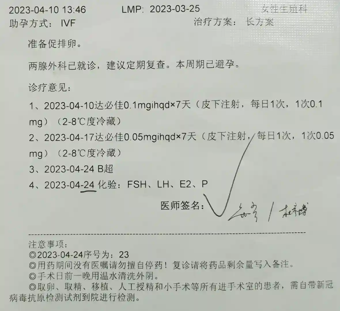 因内膜炎症服用盐酸多西环素片14天(3.22-4.4),3月25日月经第一日,按照医生要求于月经第16-18天返院要定方案了,超级激动啊。我是第17天(4.10)挂了高芹主任的号,一早去抽了血做了B超就在大厅等结果了,B超的结果手机上要下午才能看见,医生那边马上就能看见,主要是等抽血的结果。我和老公的染色体报告也都出来了,他的是“建议遗传咨询”,去医院前一天晚上看到这个的时候我还害怕了一晚上,怕出现什么变故,只挂到第二天下午的号,好在护士小姐姐为了不影响下午定方案给我加了塞儿,遗传科的医生说就像有的人长得高有的人长得矮,比如正常怀孕流产几率是百分之十,这个可能就是百分之二十,但也不是绝对的,不影响做试管,让听生殖科医生的就行,心里的石头算是落地了。下午1点半在高芹主任门口等着把病历本给了助理小姐姐,就在屋里坐着等了,先由高芹主任的助理看一下上次病历单的诊疗意见,按照意见询问一遍然后就等主任了,流程很快,我定了一代长方案,然后到二楼好像是210房间门口等着写病历,我和另一个小姐姐的病例是第一个被放进去的,后边又来了10几个人都是要写病历的,屋里只有一个医生,一个一个叫,发现后边来的都叫了还没到我俩,等的花儿都谢了。后来是高芹主任屋里的小姐姐来把我俩的病例本拿走了,说这边人太多她们拿下去自己写,也就相当于把所有病例再过一遍,然后签了字,接下来按照新的病例流程,拿药、买冰袋(在后院角落的小超市5元2角)、107听讲解后边的流程、去打针。我拿的是达必佳,前7天每日一支,后7天每日半支,我今天打第4天了,前两天是在山大生殖打的,第三天开始在社区医院打,每次2.5元,我这个是打在胳膊上的,给后边打针的小姐姐一个温馨提示,因为这个针需要冷藏保存,我每次都是拎着冰袋去诊所,但是要提前5分钟把针从冰袋里拿出来,这样打进去不会疼,要不然药太凉打着会很疼,我这边是学校里的校医,说之前见的都是打肚子上没见过打胳膊的,所以给我打的很慢,还帮我边打边揉胳膊,所以一点儿都不疼,好开心遇见这么好的医护小姐姐。前边的检查虽有问题,总也算顺利进周了,希望后边一切都能顺顺利利的