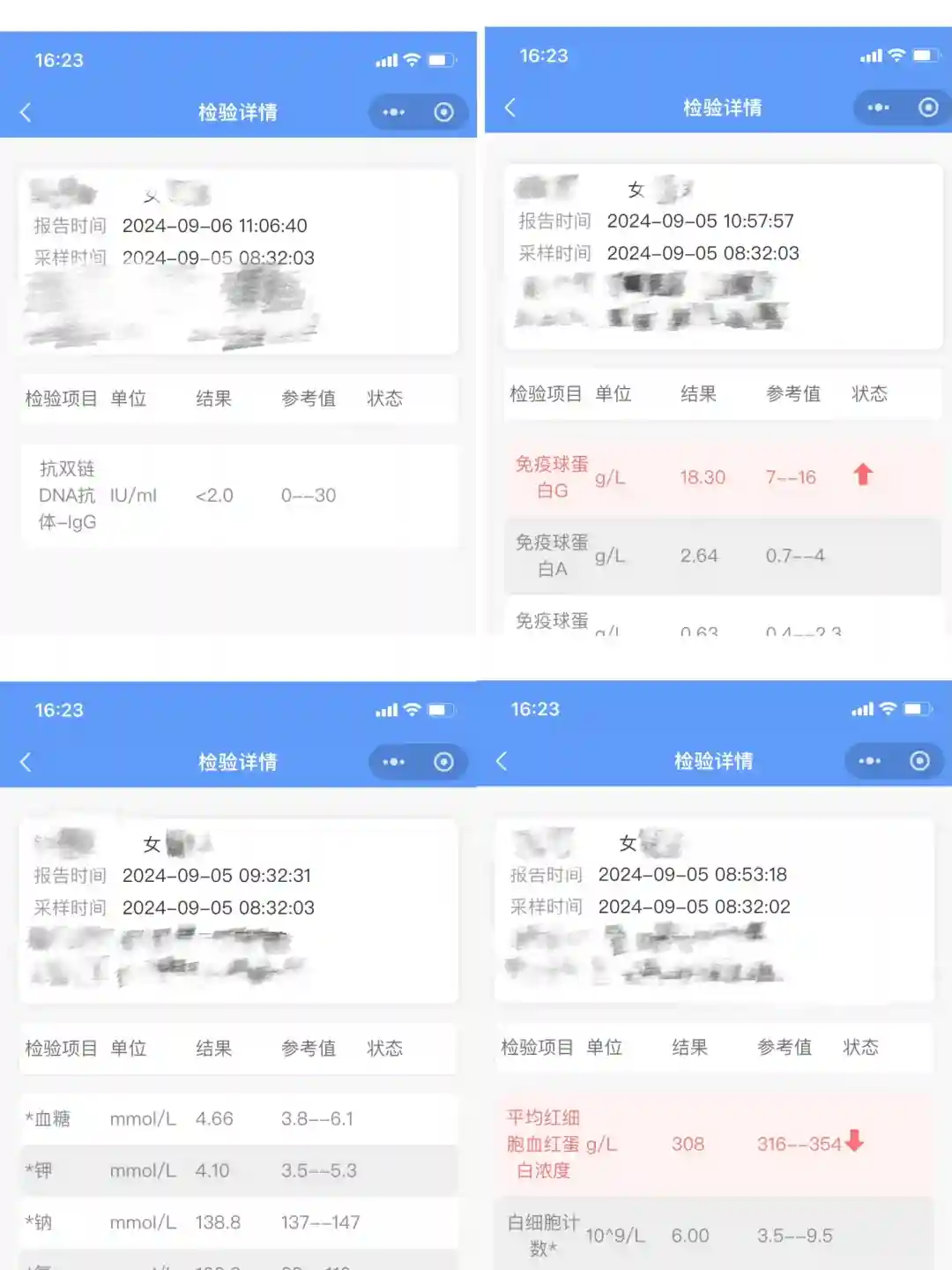 抽了一天空去检查做了5项。1.尿常规2.血细胞分析+CRD 3.大生化检验组合4.免疫球蛋白+补体测定5.抗双链DNA抗体lg G测定。