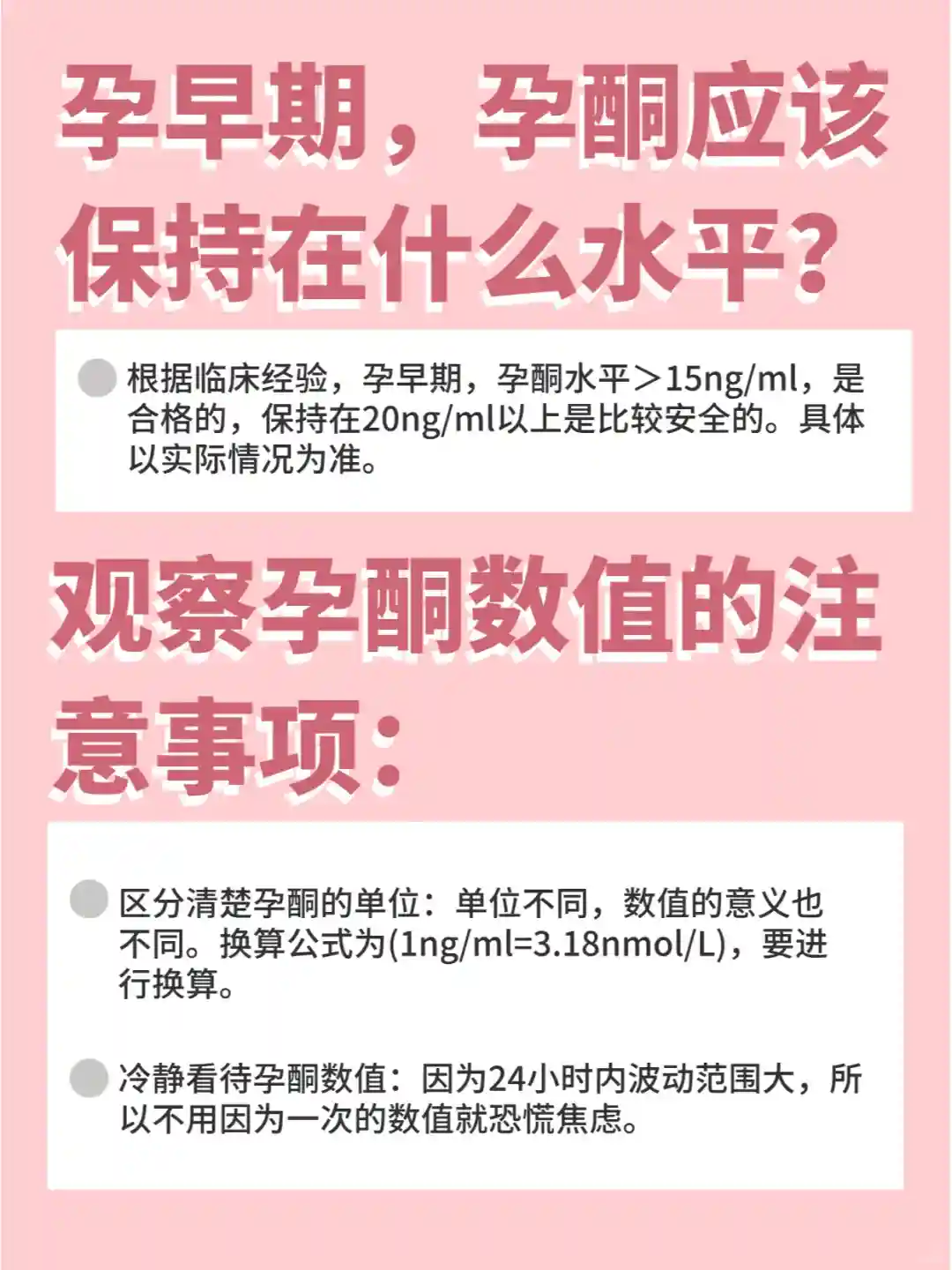 一般而言,孕酮平均值≥25ng/ml不用过于担心,如果≤15ng/ml,则应该格外注意,排查是否胚胎发育不良。