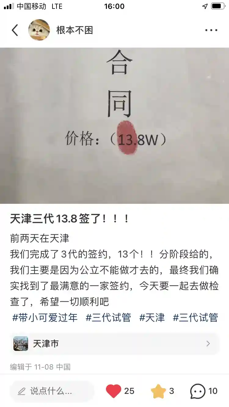 首先,我确实是签的在天津这边的,之前也去其他地方看过,都没什么用,钱倒是乱花了十几万了,我为什么知道这个地方有呢,是之前前我家里人也是在这里做的的,当时她四五年了没有怀上,加上是二婚,年纪也有点大了,经过多方打探才知道现在的位置的,
