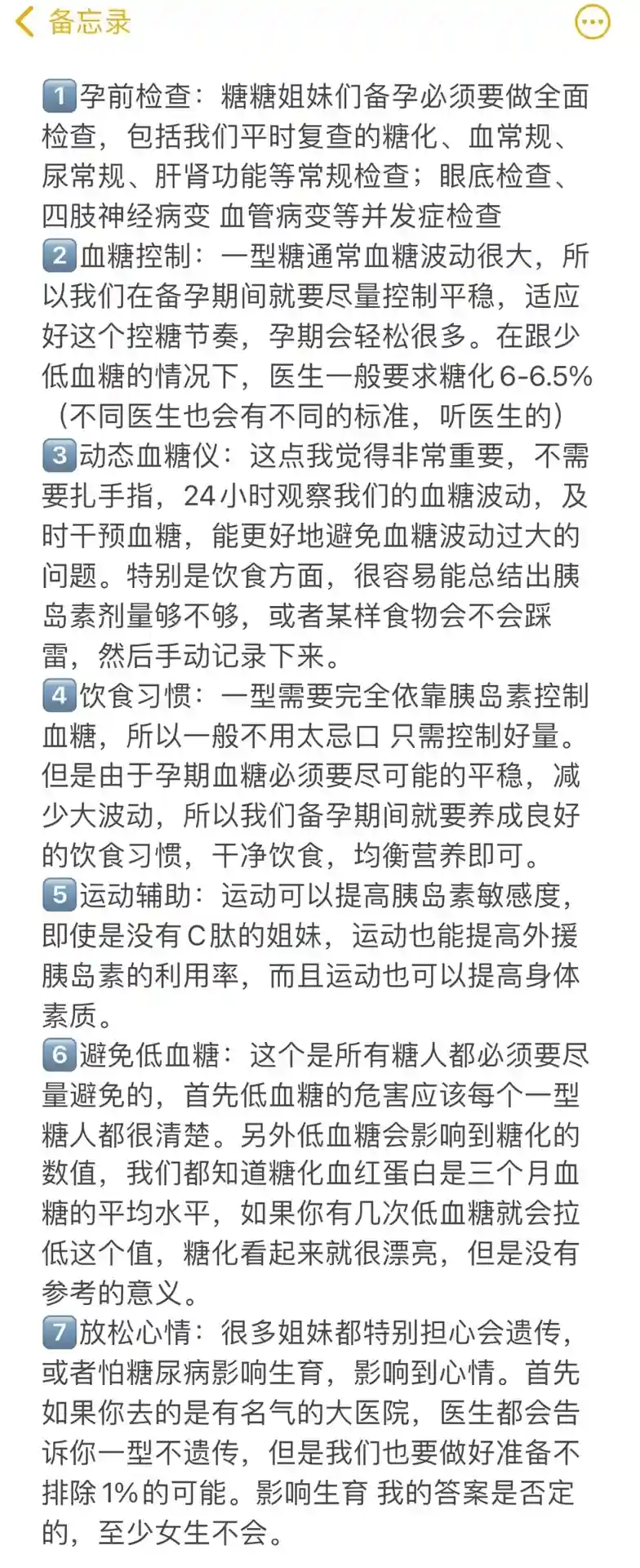 2⃣️血糖控制:一型糖通常血糖波动很大,所以我们在备孕期间就要尽量控制平稳,适应好这个控糖节奏,孕期会轻松很多。在跟少低血糖的情况下,医生一般要求糖化6-6.5%(不同医生也会有不同的标准,听医生的)