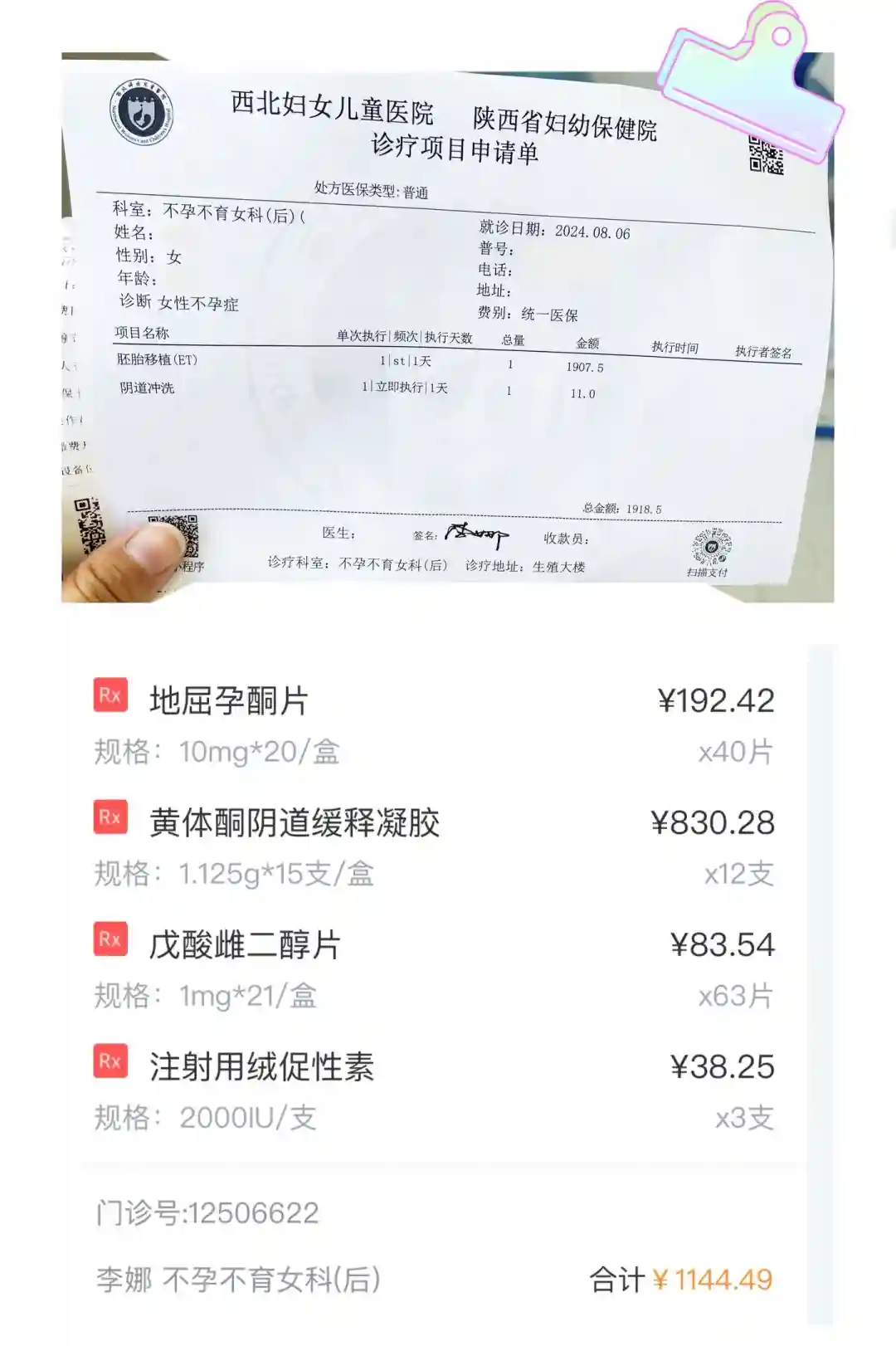 移植其实很快,也就3~5分钟就结束了,可以上厕所,之后在休息室躺15~20分钟即可。之后拿着医生开的药单去一楼取药,里面有黄体酮凝胶和绒促性素,这两样需要冷藏,去之前记得带上冷藏包,我没有冷藏包,直接用的是装餐盒的保温袋里面放的冰袋,也是一样的效果。
