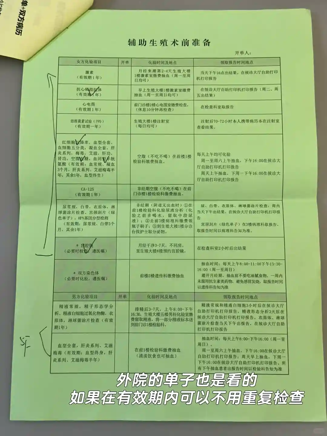 检查可以看第二张图,男女需要做的检查都有~ 我带了一部分外院的检查,医生都是看的。在有效期内的话就可以不用重复做。除了这张图片上的检查,还给了张单独的单子,是可以自主选择做还是不做的基因检测。