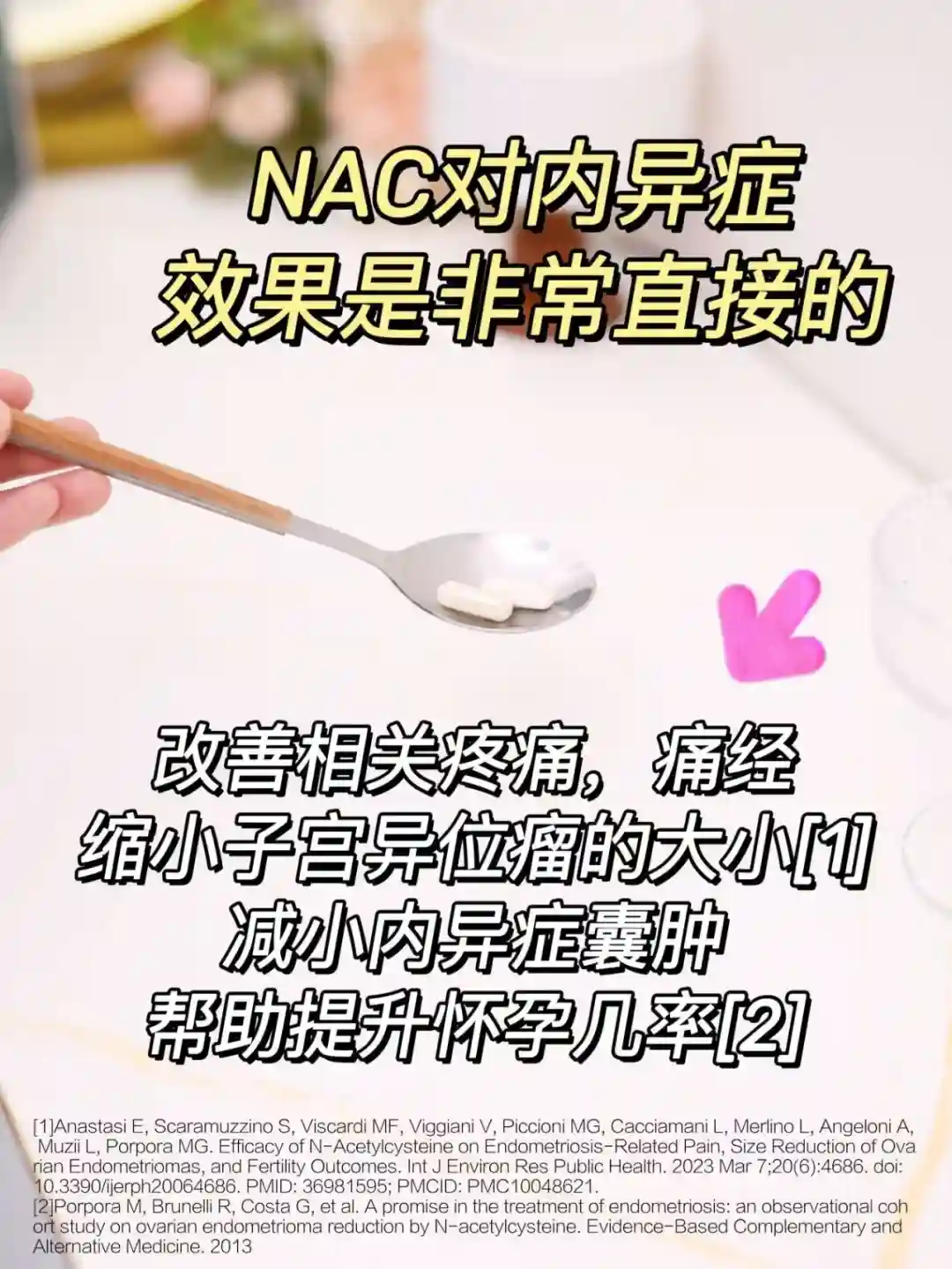 2013年的一项观察性队列研究中,47名子宫内膜异位症患者接受了NAC治疗,3个月干预期后,通过盆腔超声进行评估发现:NAC治疗组中,24例患者因囊肿减少或消失、疼痛减轻或怀孕。[3]