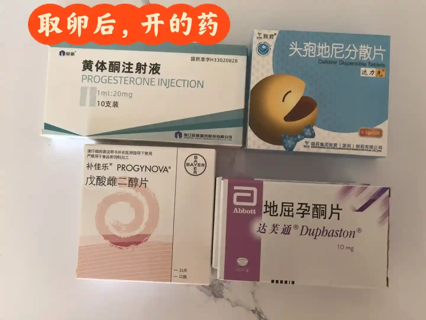 1月13日(周一),无麻醉取卵,取了6颗卵,因为lh比较低开了注射黄体酮,还有地屈孕酮补佳乐和头孢