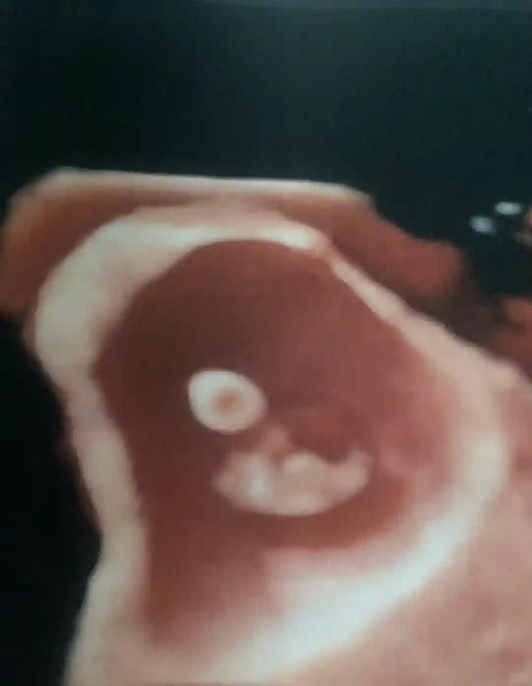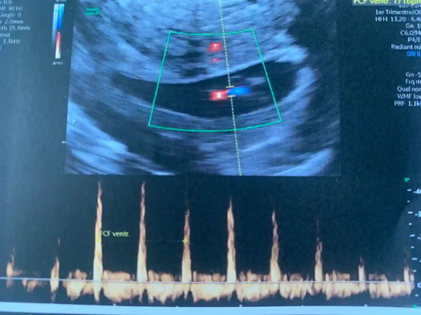首先是看到黑乎乎的一个椭圆形,我说“什么都没有呀医生”,当时脑海里想到一个词“空囊” 虽然我具体也不知道这是什么意思。然后医生说“别着急”,探头转了几下之后,一下子就看到一个人形的小东西了,感觉还挺神奇的。接着就看到像图片里那样的小红点,我问“那是什么”,医生说“那是TA的心,我让你听一下声音”,然后就听到“bong bong bong”声,很紧凑很响亮有力(可能医生外放设备比较好?)