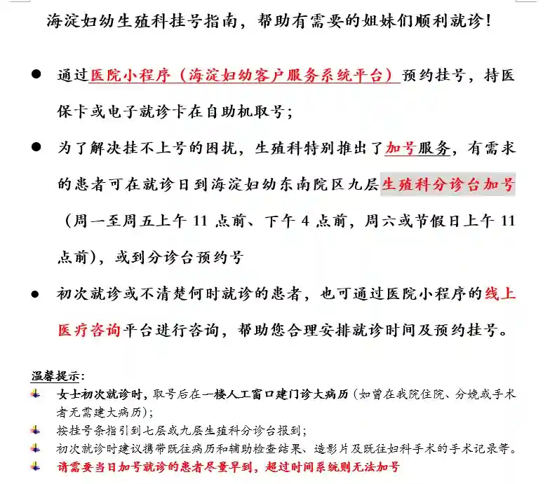 ✅为了解决挂不上号的困扰,生殖科特别推出了加号➕服务,有需求的患者可在就诊日到海淀妇幼东南院区九层生殖科分诊台加号(周一至周五上午点前、下午点前,周六或节假日上午点前),或到分诊台预约号。