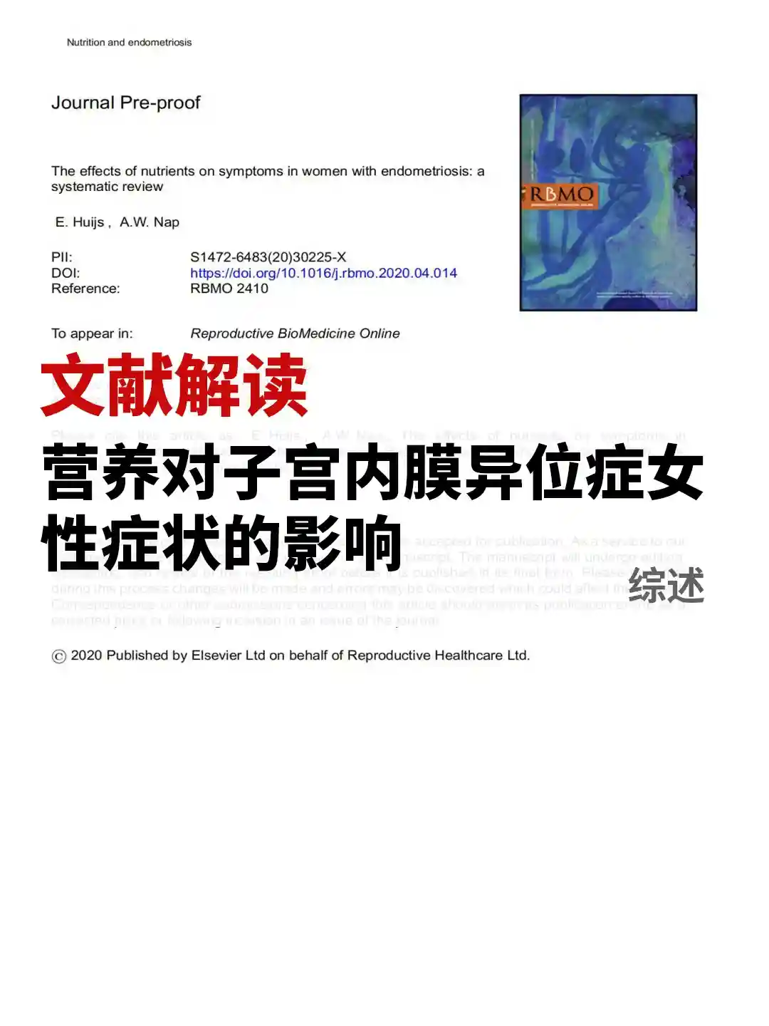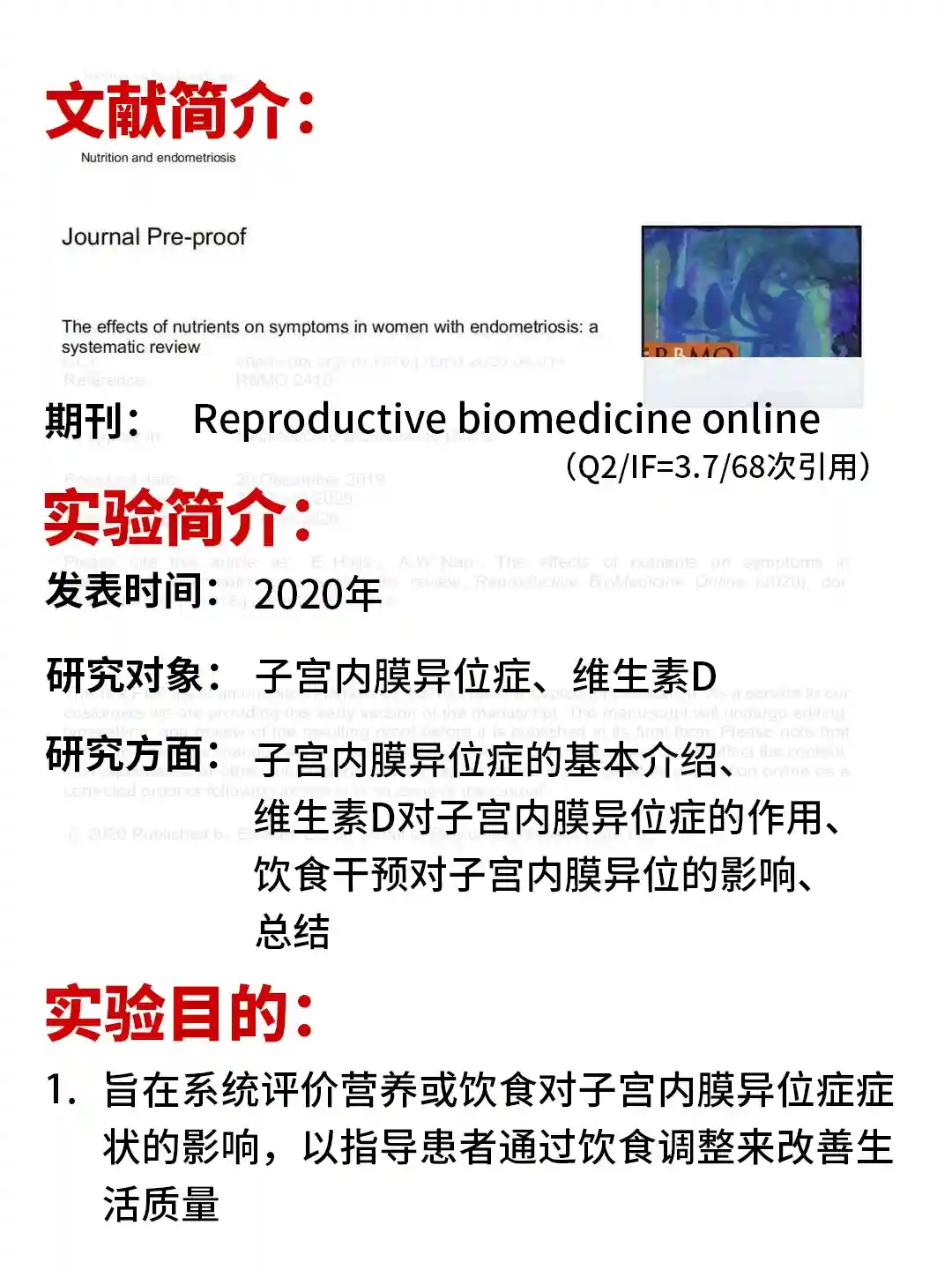 👉本综述的目的旨在系统评价营养或饮食对子宫内膜异位症症状的影响,以指导患者通过饮食调整来改善生活质量。