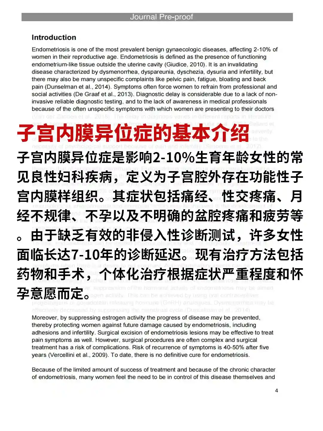 子宫内膜异位症是影响2-10%生育年龄女性的常见良性妇科疾病,定义为子宫腔外存在功能性子宫内膜样组织。其症状包括痛经、性交疼痛、月经不规律、不孕以及不明确的盆腔疼痛和疲劳等。由于缺乏有效的非侵入性诊断测试,许多女性面临长达7-10年的诊断延迟。现有治疗方法包括药物和手术,个体化治疗根据症状严重程度和怀孕意愿而定。
