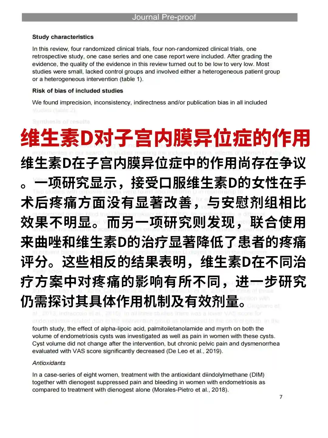 维生素D在子宫内膜异位症中的作用尚存在争议。一项研究显示,接受口服维生素D的女性在手术后疼痛方面没有显著改善,与安慰剂组相比效果不明显。而另一项研究则发现,联合使用来曲唑和维生素D的治疗显著降低了患者的疼痛评分。这些相反的结果表明,维生素D在不同治疗方案中对疼痛的影响有所不同,进一步研究仍需探讨其具体作用机制及有效剂量。