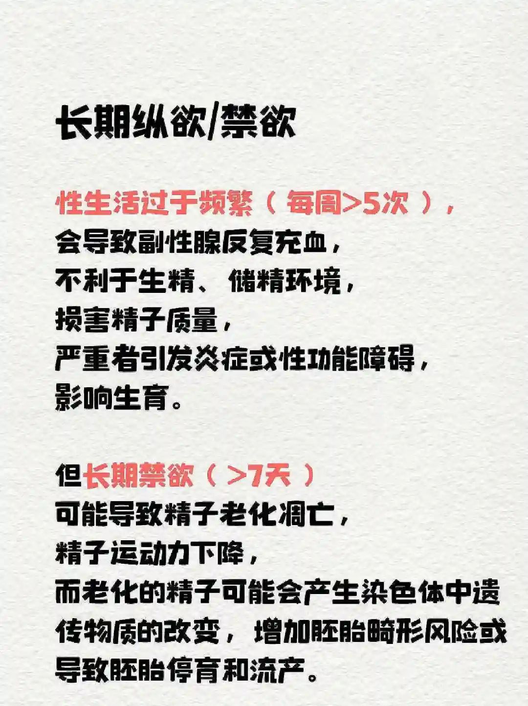 但长期禁欲(>7天)可能导致精子老化凋亡,精子运动力下降,