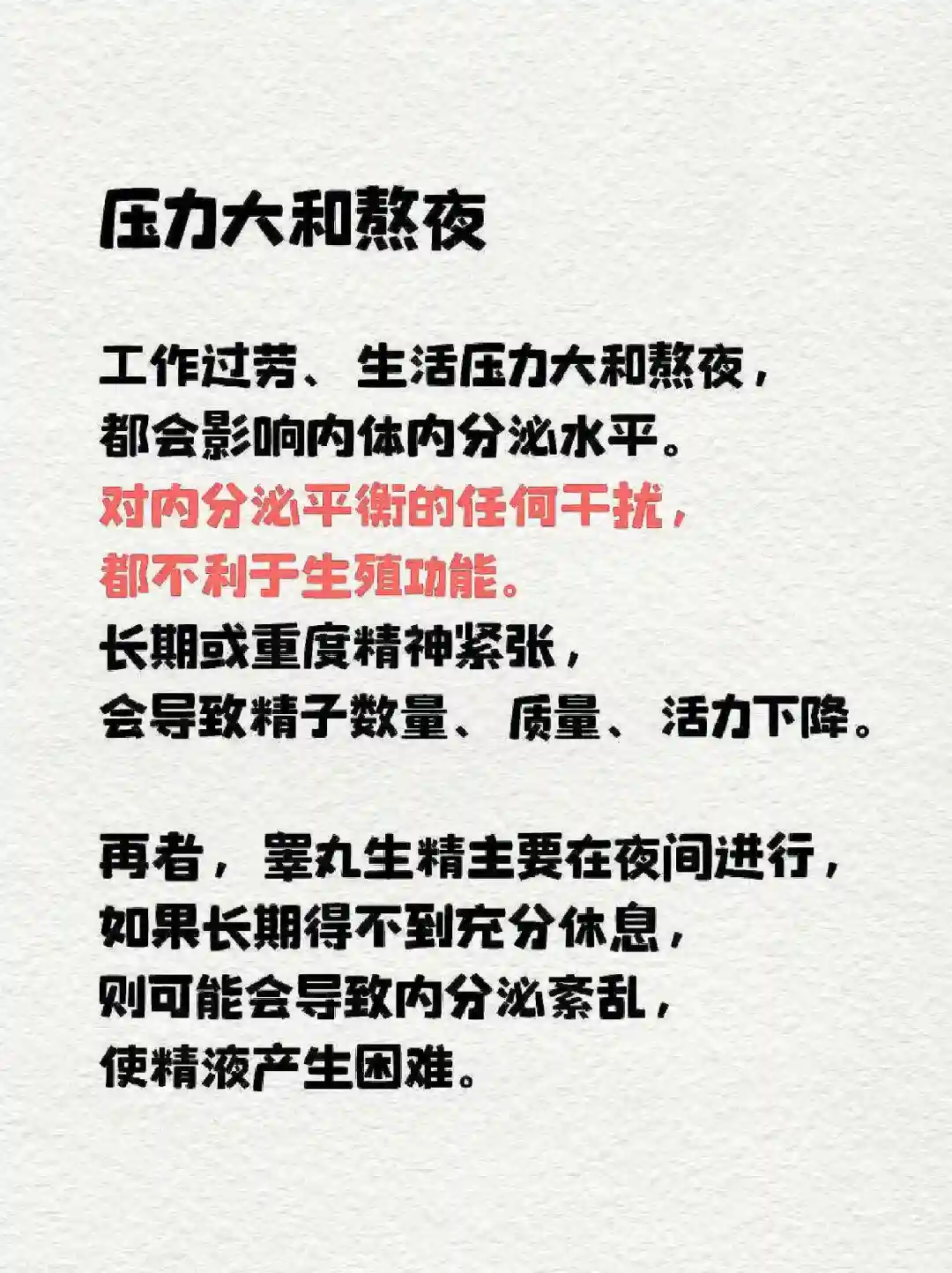 再者,睾丸生精主要在夜间进行,如果长期得不到充分休息,则可能会导致内分泌紊乱,使精液产生困难。