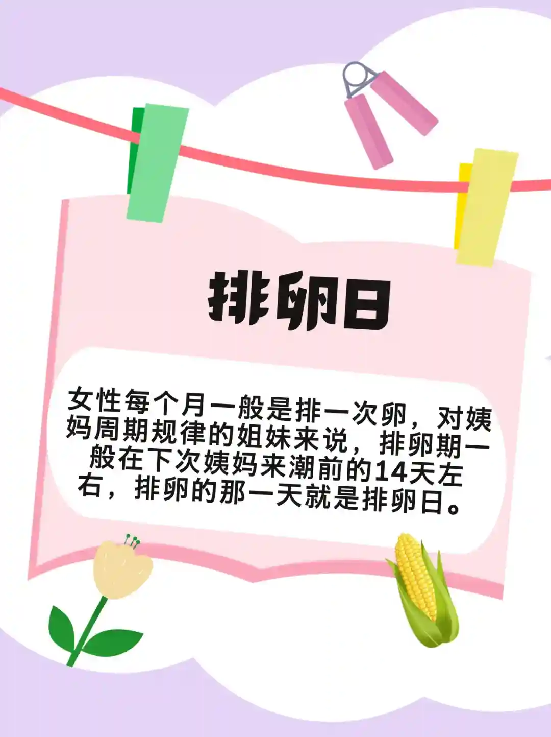 排卵日:女性每个月一般是排一次卵,对姨妈周期规律的姐妹来说,排卵期一般在下次姨妈来潮前的14天左右,排卵的那一天就是排卵日。