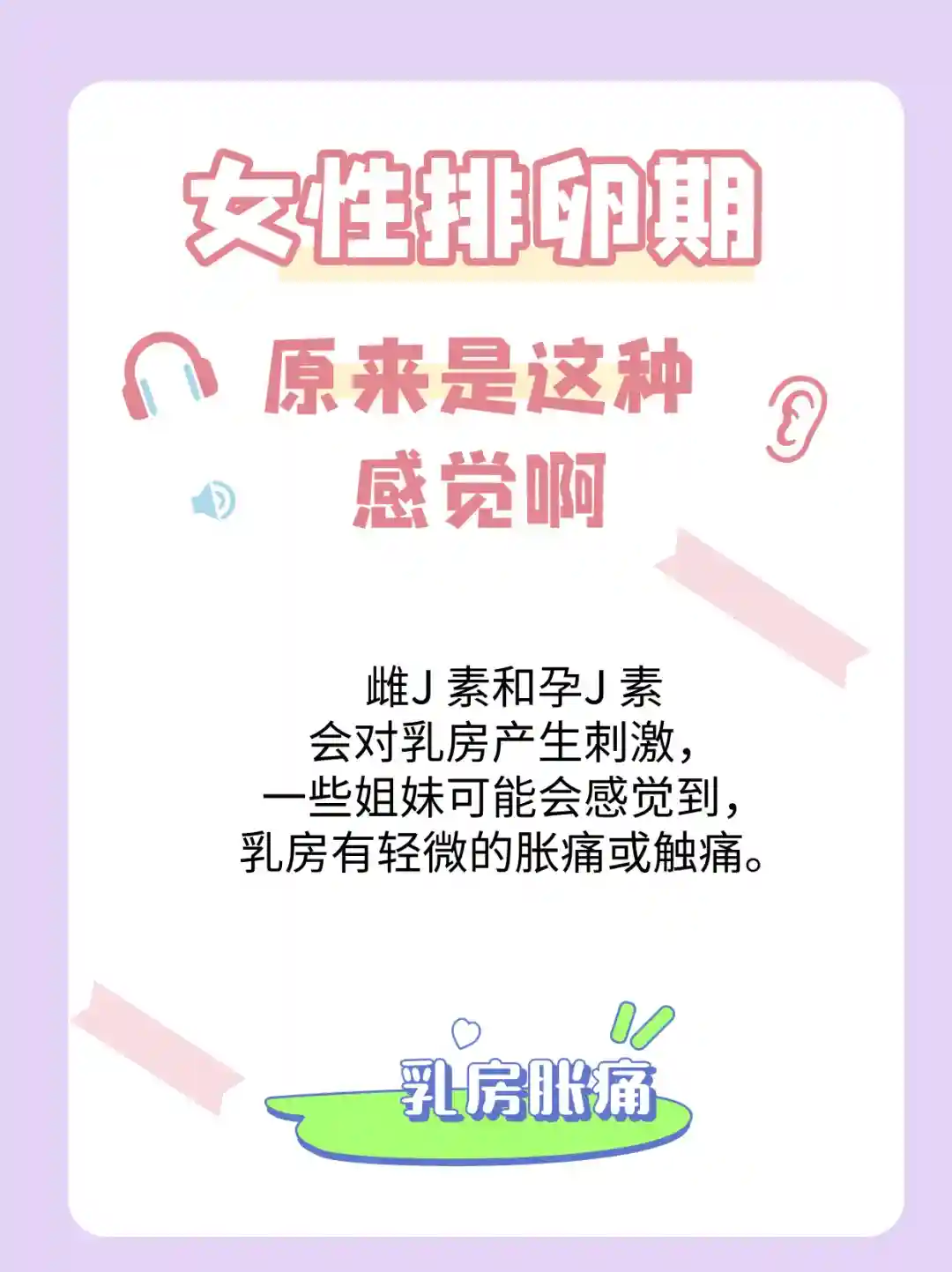 雌J 素和孕J 素会对乳房产生刺激,一些姐妹可能会感觉到乳房有轻微的胀痛或触痛。