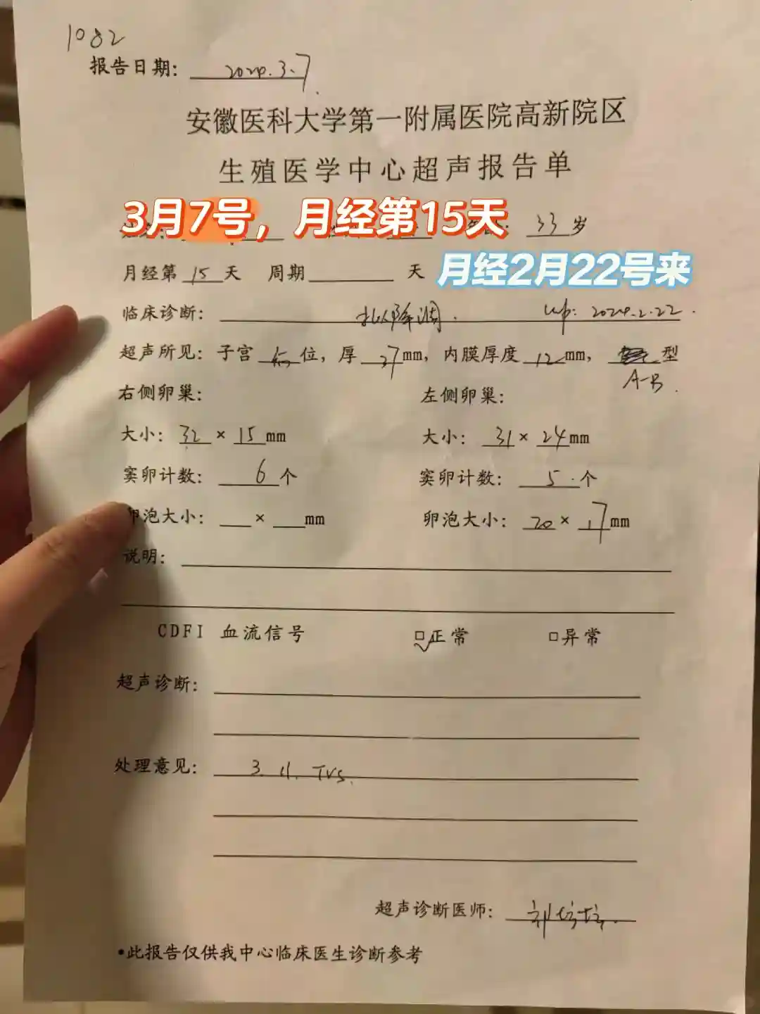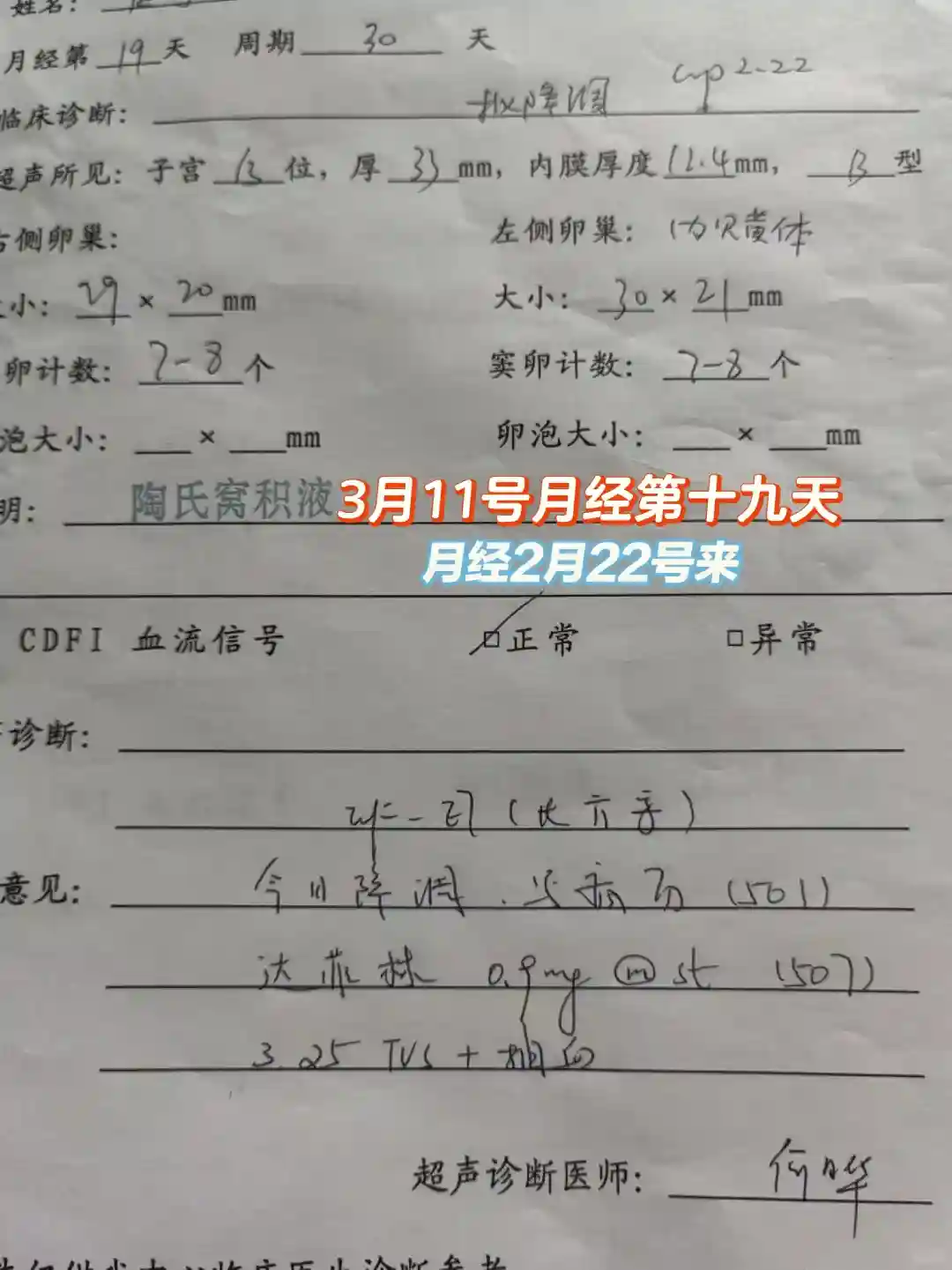 于是第15天3月7号去看诊了,吴医生让我做了一个b超,看图二,有一个优势卵泡,20*17mm,下次是月经第19天看诊。