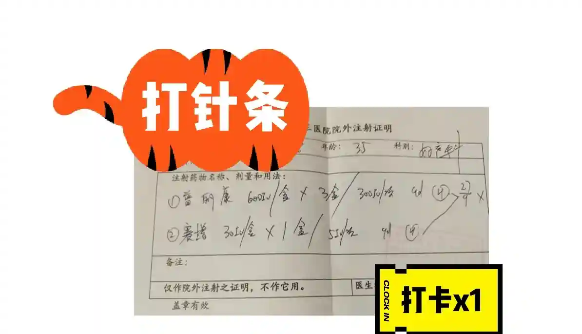 促排药需要低温保存,可以提前准备保温箱和冰袋。打针可以在三院注射室,如果不想每天回医院打针,可以自己打,或者在护士台开“打针条”到社区医院打(图2)。普丽康有注射笔,加尼药盒里有注射器,在家打完全没问题。赛增的有水剂和粉剂,都不带注射器,比较难以把握用量。看到有些姐妹打水剂的赛增医院也提供了注射笔,不过三院没有。
