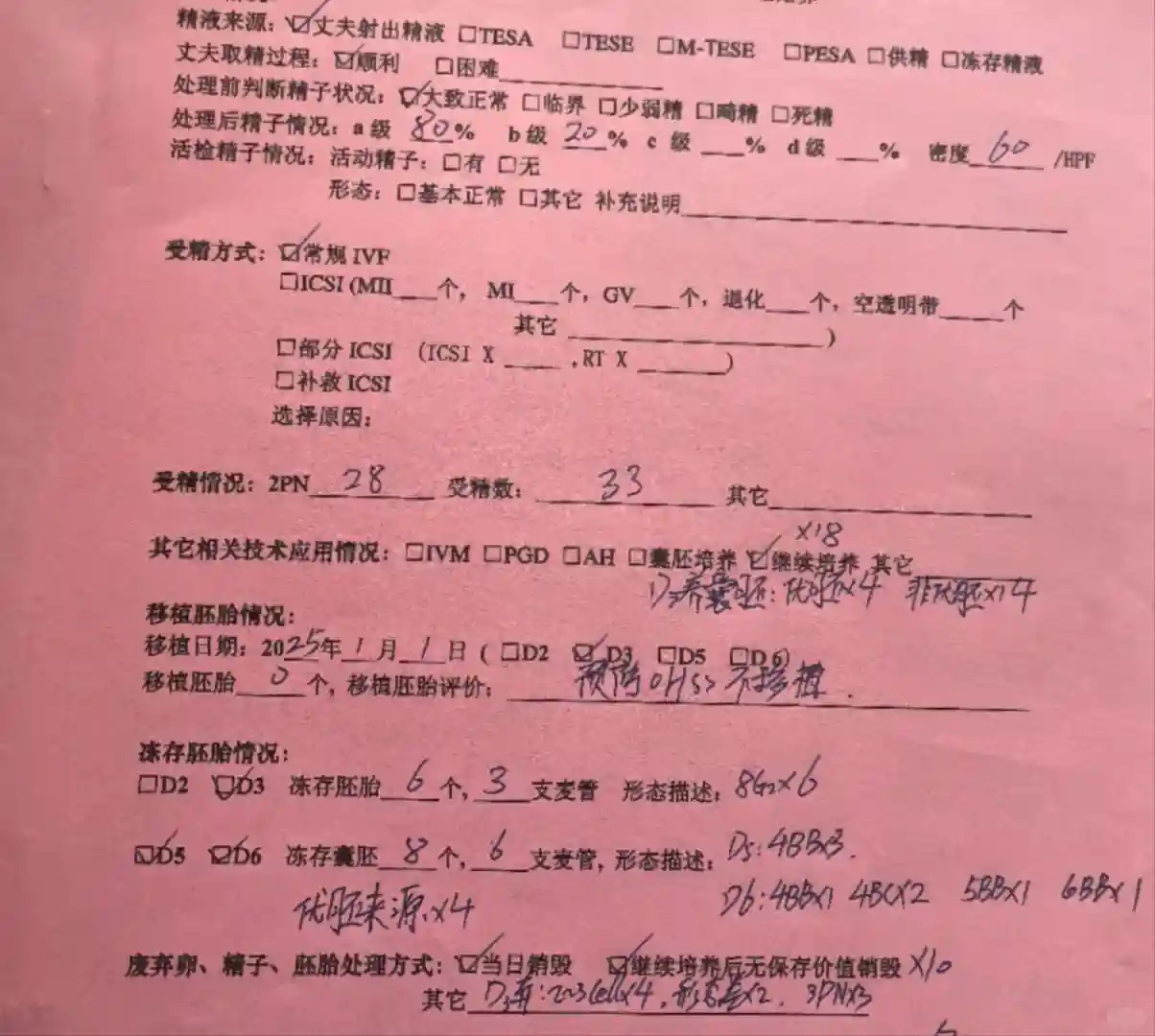 2025.1.1 返院,停止吃地屈孕酮和头孢,看胚胎培养状况,培养成功24个,6个d3冻胚,剩余18建议培育囊胚,取卵过多,雌二醇过高,不建议本周期移植鲜胚。