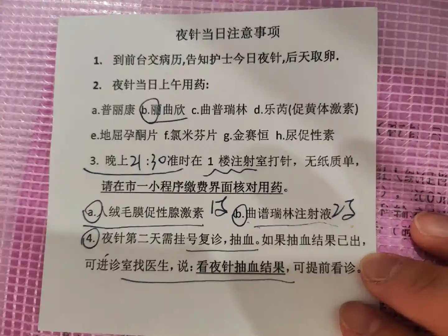 1、6.20开始促排,6.29确定夜针,6.29白天不用打普丽康了!就打了一支丽曲欣防排哦!