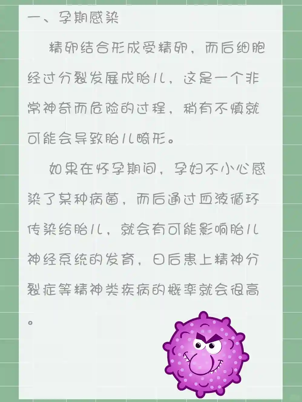 如果在怀孕期间,孕妇不小心感染了某种病菌,而后通过血液循环传染给胎儿,就会有可能影响胎儿神经系统的发育,日后患上精神分裂症等精神类疾病的概率就会很高。