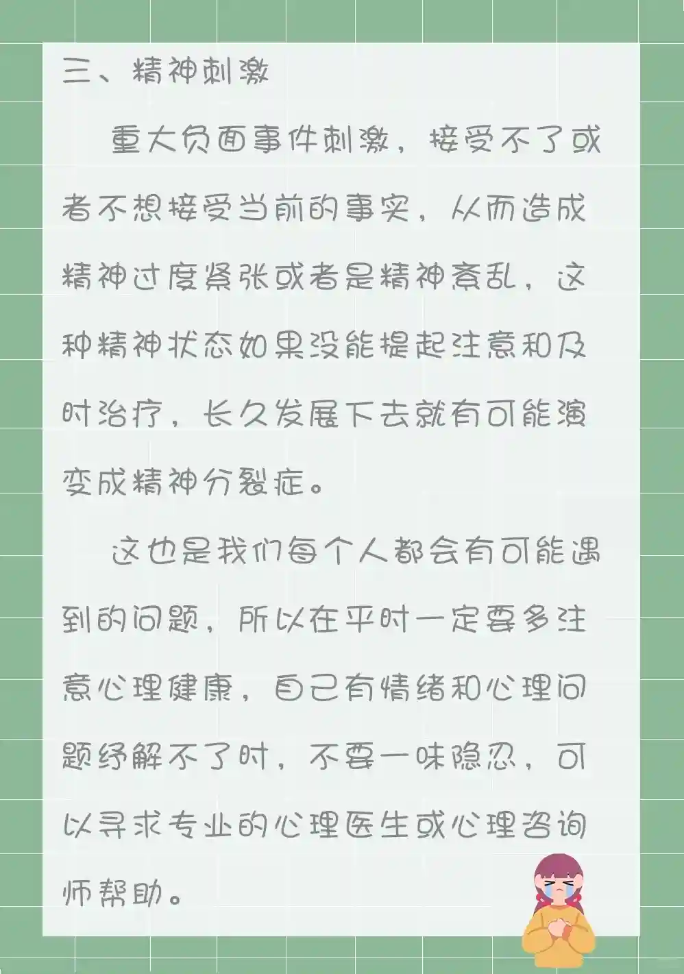 重大负面事件刺激,接受不了或者不想接受当前的事实,从而造成精神过度紧张或者是精神紊乱,这种精神状态如果没能提起注意和及时治疗,长久发展下去就有可能演变成精神分裂症。