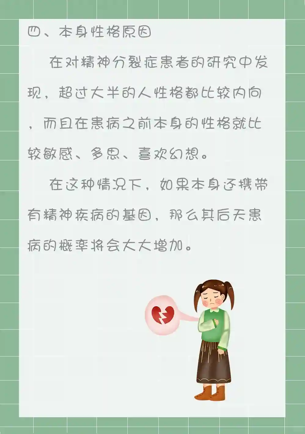4⃣本身性格原因在对精神分裂症患者的研究中发现,超过大半的人性格都比较内向,而且在患病之前本身的性格就比较敏感、多思、喜欢幻想。