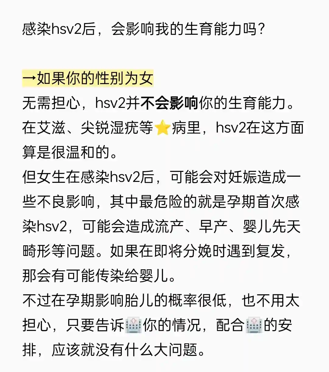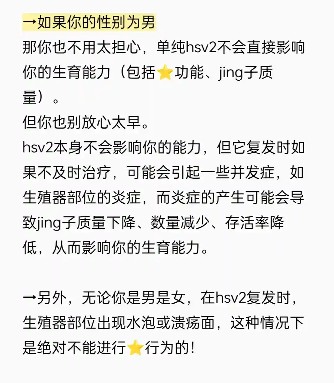 那你也不用太担心,单纯hsv2不会直接影响你的生育能力(包括⭐功能、jing子质量)。