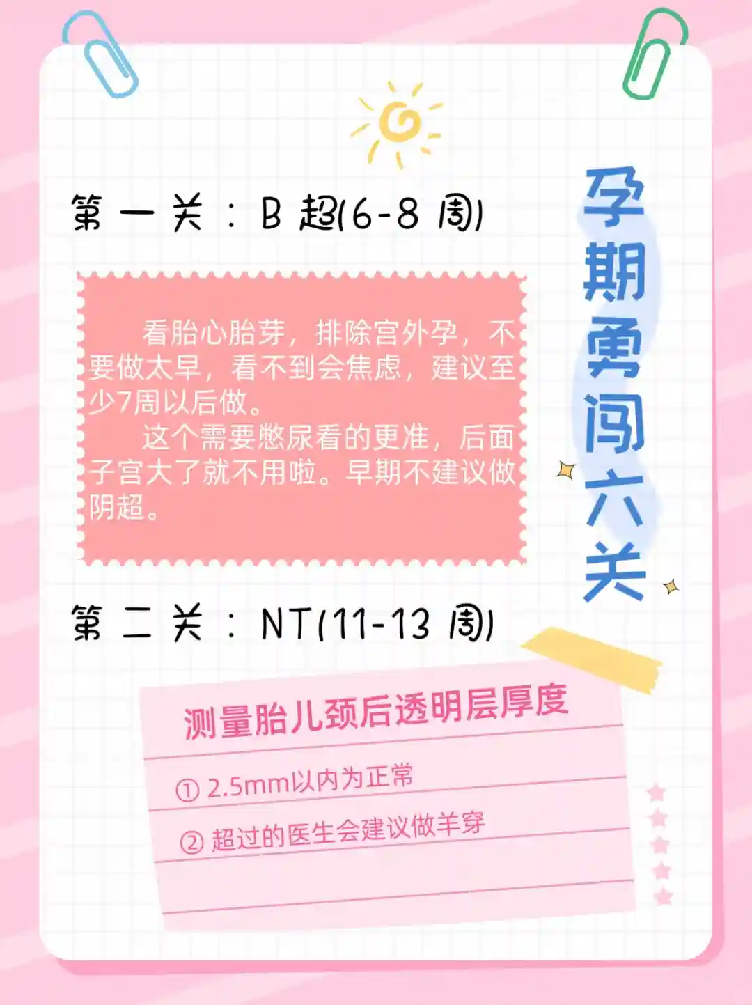 11-13w 医院NT检查胎儿颈部透明层,2.5mm 以下为正常。12w之后可以着手户口所在社区医院建档了 ,有很多小的检查完全可以在社区医院做。像微量元素测定,肝功肾功,叶酸代谢。