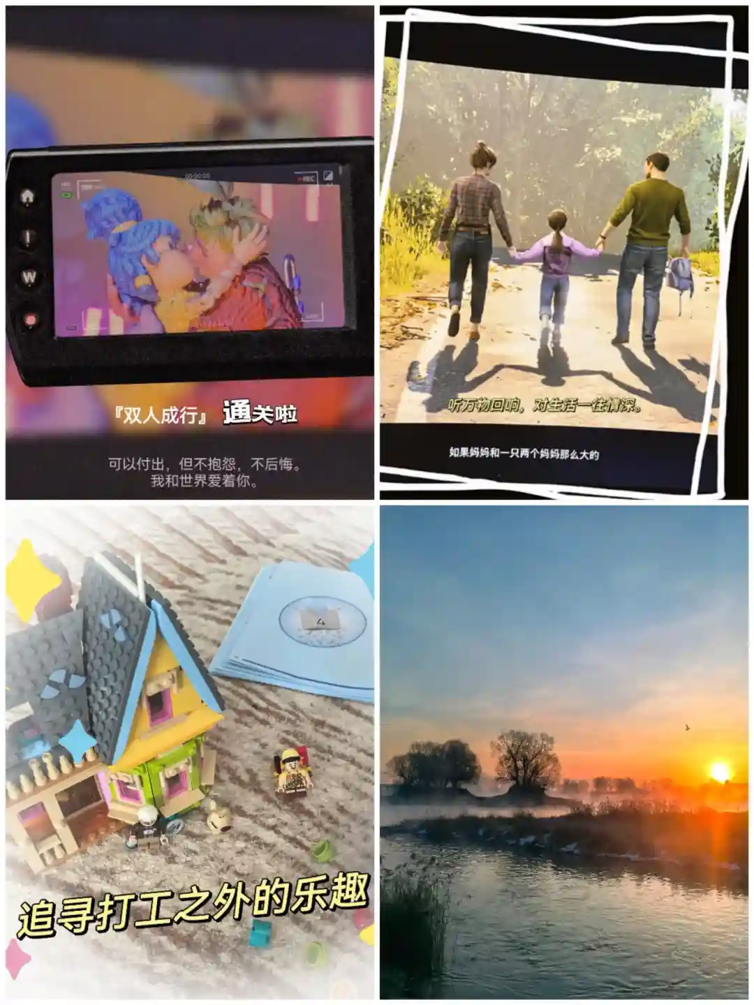 我的实践:打游戏→和老公通过双人成行,慢慢理解“爱是常觉亏欠”,共同期待我们的孩子;拼logo→提高专注力的同时,装饰家也装饰心;赏美景→有个永不扫兴的老公,带我看冬日日出、自驾游。