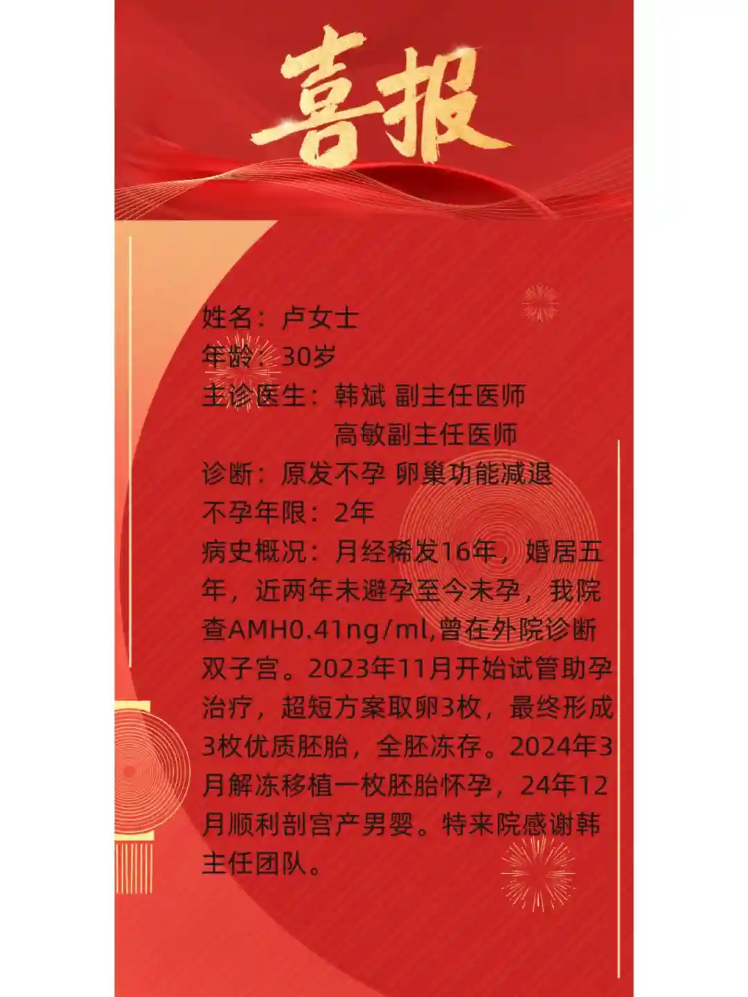 2024年3月解冻移植一枚胚胎怀孕,24年12月顺利剖宫产男婴。特来院感谢韩斌主任团队。