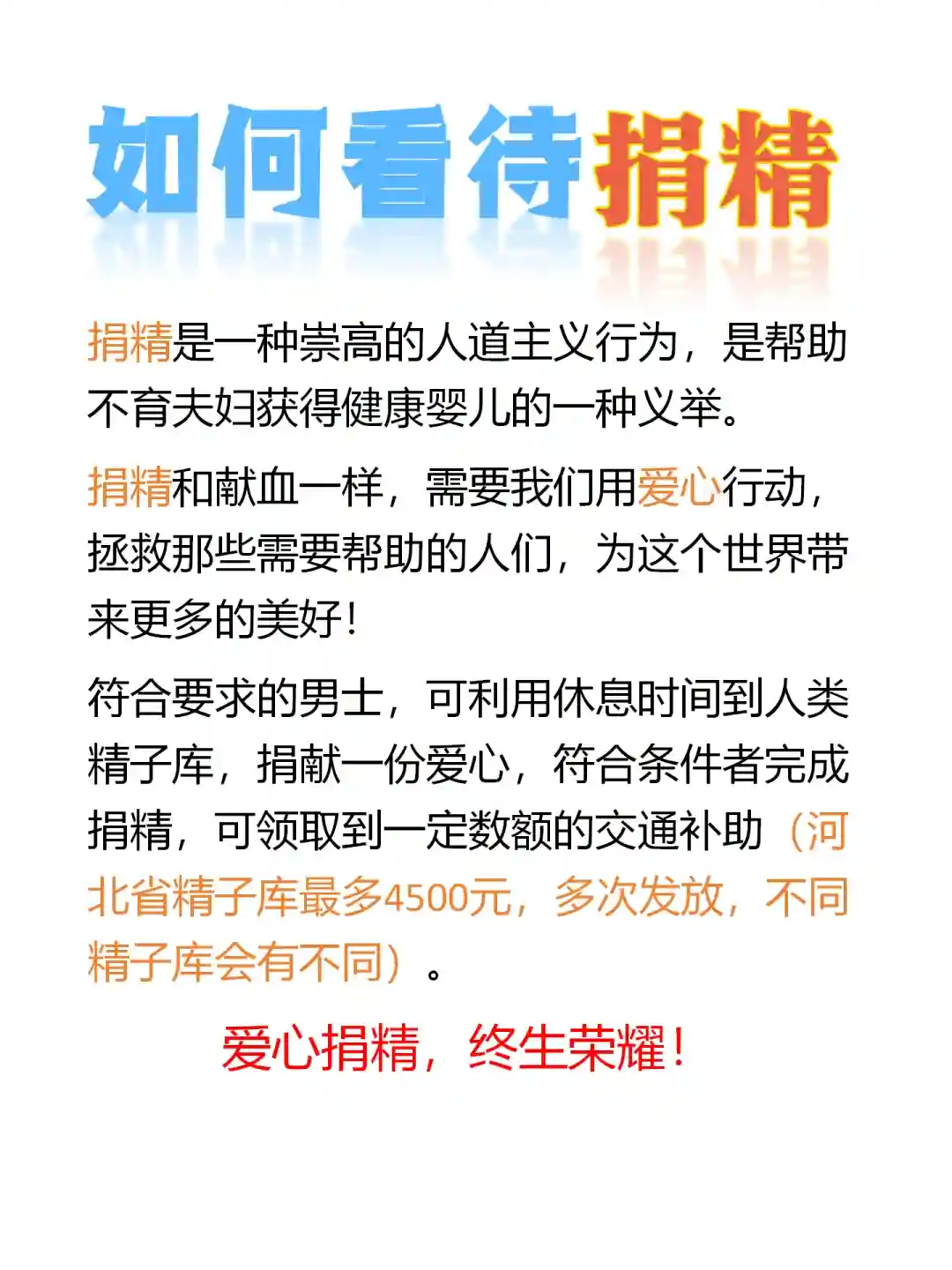 符合要求的男士,可利用休息时间到人类精子库,捐献一份爱心,符合条件者完成捐精,可领取到一定数额的交通补助(河北省精子库最多4500元,多次发放,不同精子库会有不同)。