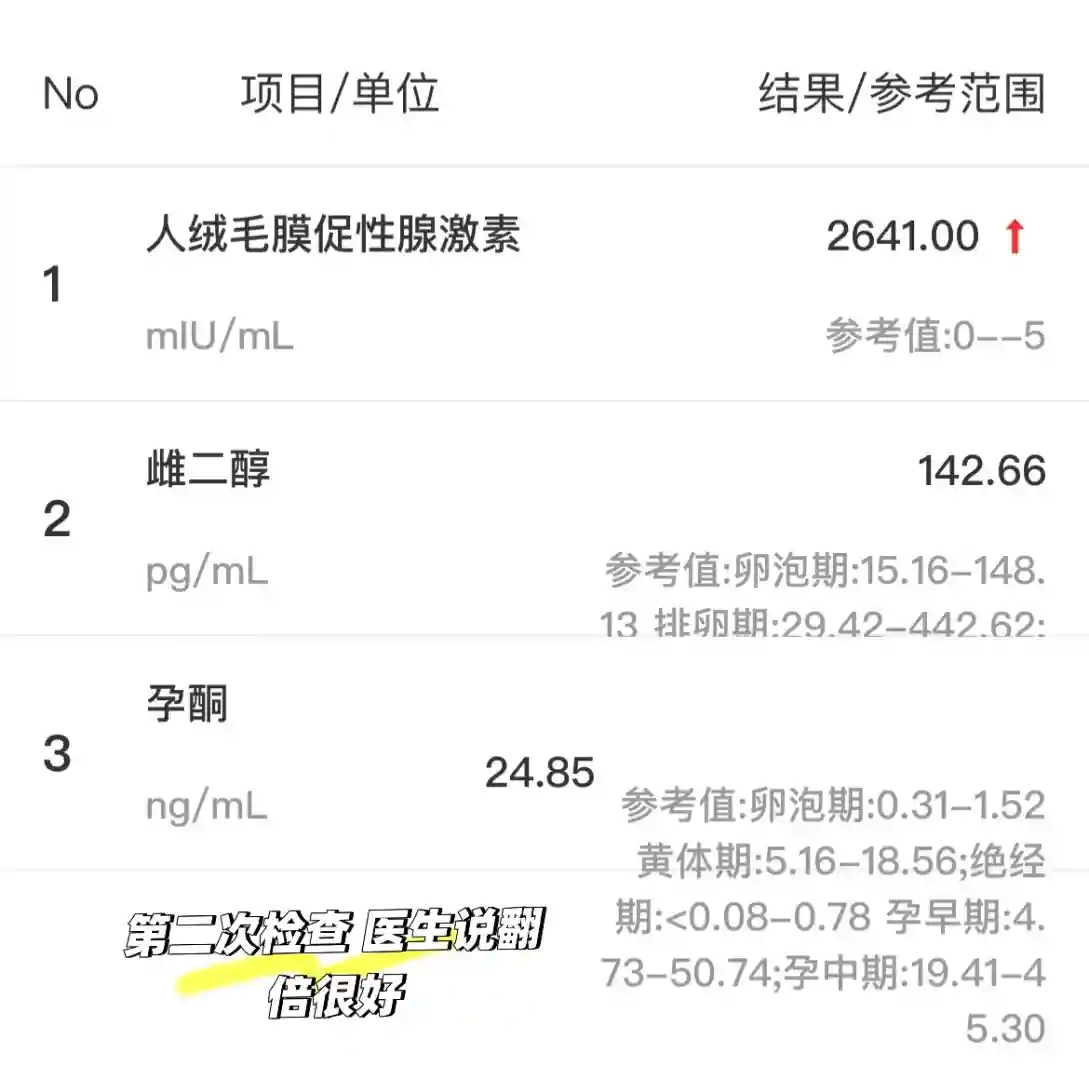第二次检查,医生说我hcg翻倍不错,我看孕酮下降了那么多,有点担心,询问了医生,医生说这是正常的,说我的孕酮已经非常好了,让我10天之后再来做B超。