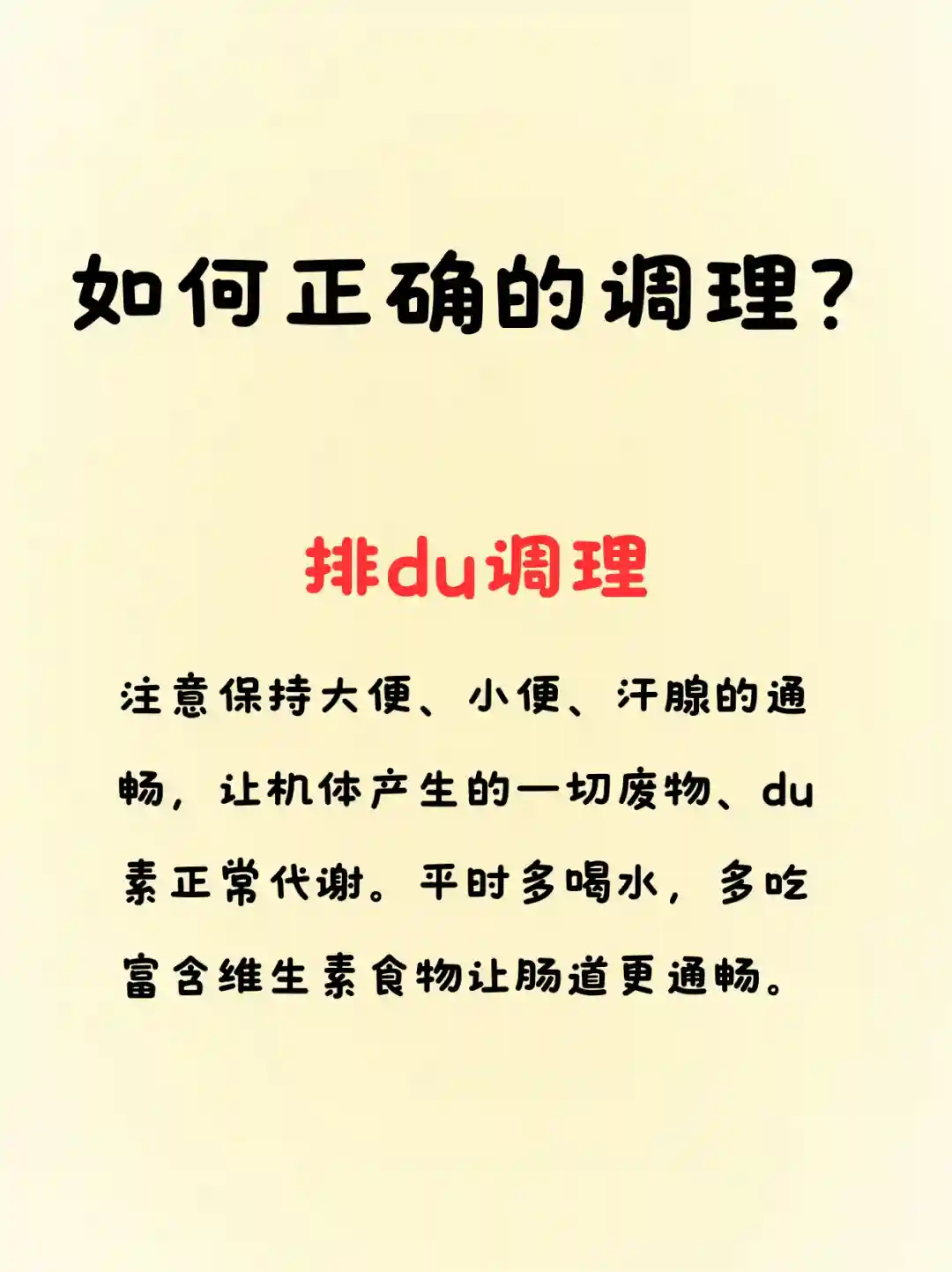 注意保持大便、小便、汗腺的通畅,让机体产生的一切废物、du素正常代谢。平时多喝水,多吃富含维生素食物让肠道更通畅。