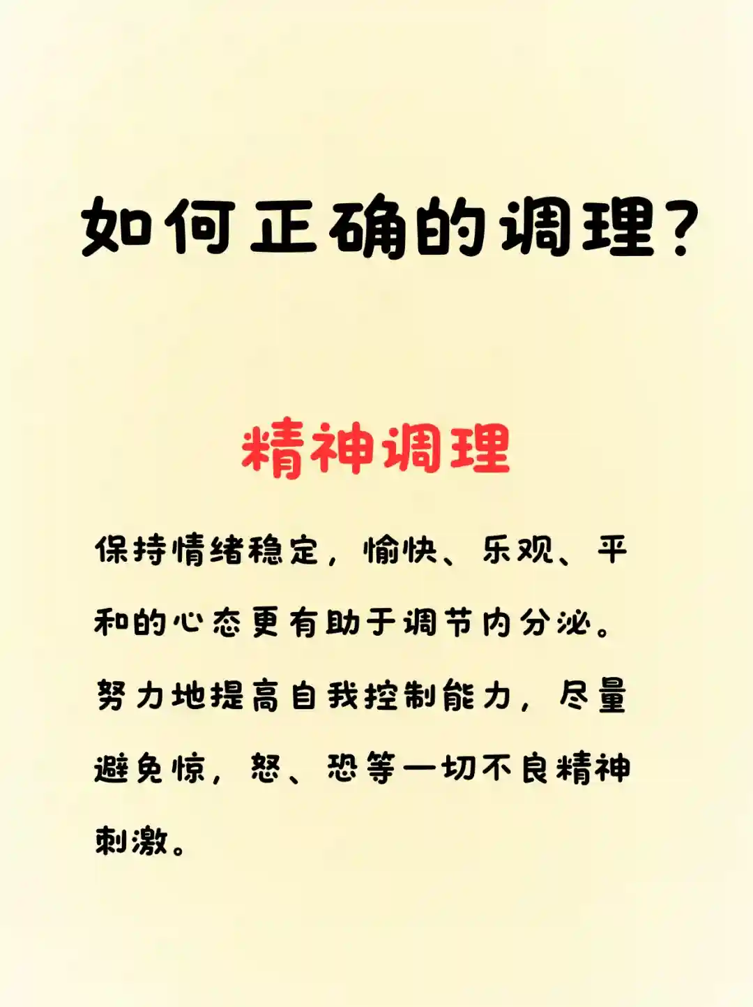 保持情绪稳定,愉快、乐观、平和的心态更有助于调节内分泌。努力地提高自我控制能力,尽量避免惊,怒、恐等一切不良精神刺激。