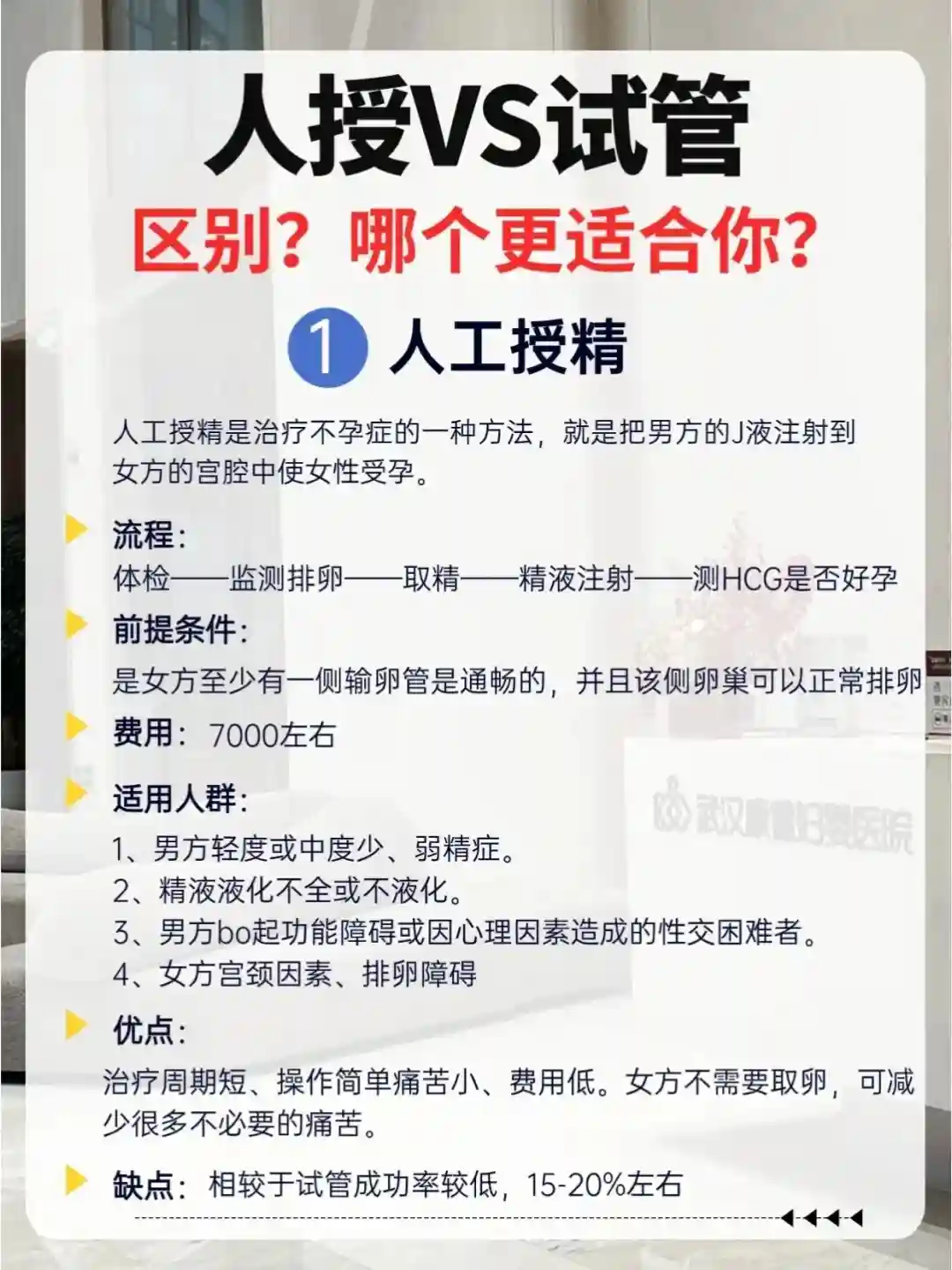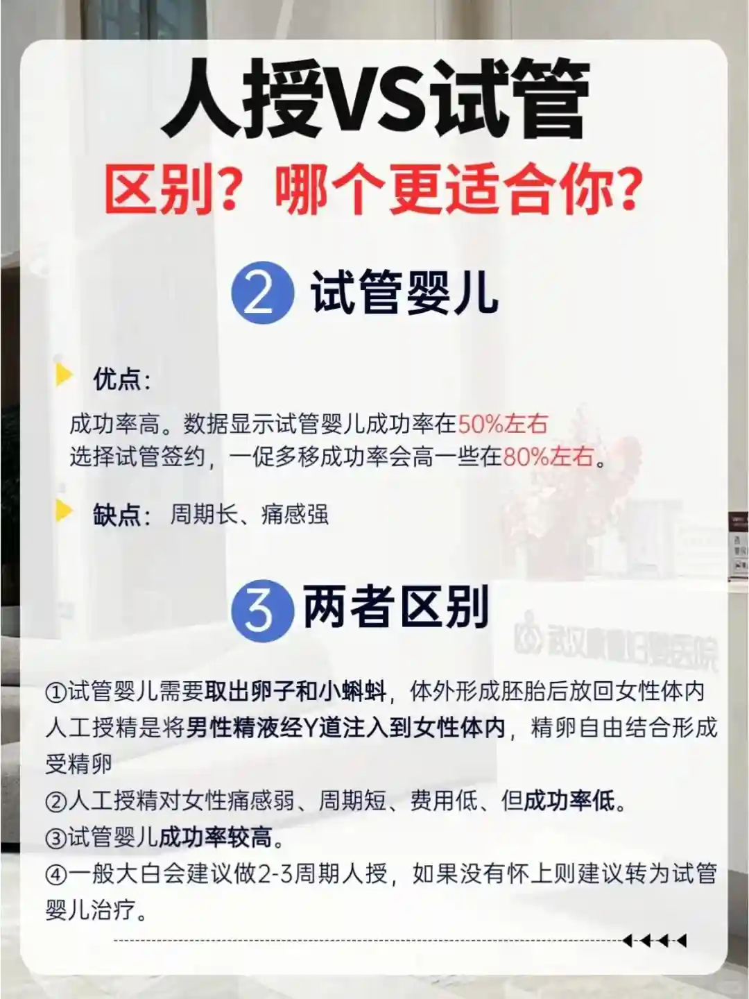 2️⃣ 人工授精的过程相对痛感较弱、周期较短且费用较低,但成功率也较低;而试管婴儿的成功率较高。