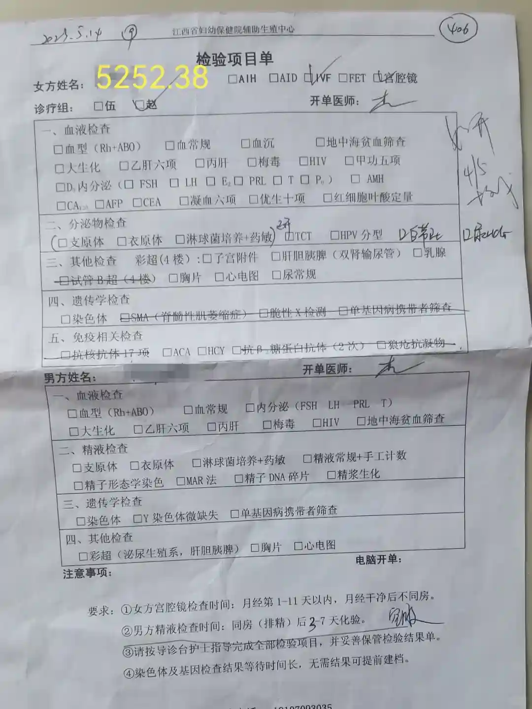之前检查的单子我都带去了,有最近检查的尽量都带,医生会看有没有用,可以省到钱,医生问了我的情况后加了个宫腔镜检查(图二),B超排队超多人,这一项要先去报道,然后就是抽血,其他的就可以边看排队情况边做(排队看图四),差不多了再过去。乳腺,阴超,肝胆都是分开排的B超,我是刚好碰到一个很好的医生问我要不要在他手里都检查完,呢肯定啊,这么好的事,也不用多排两下了,节省了一些时间,第一天上午除了宫腔镜大概三个小时所有的检查都做完了,女方一共是5252.38元。