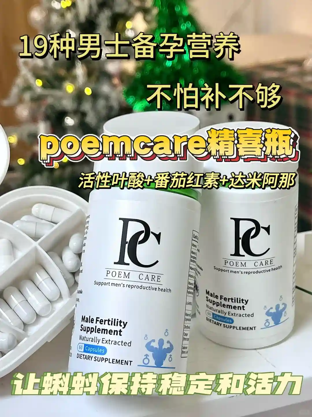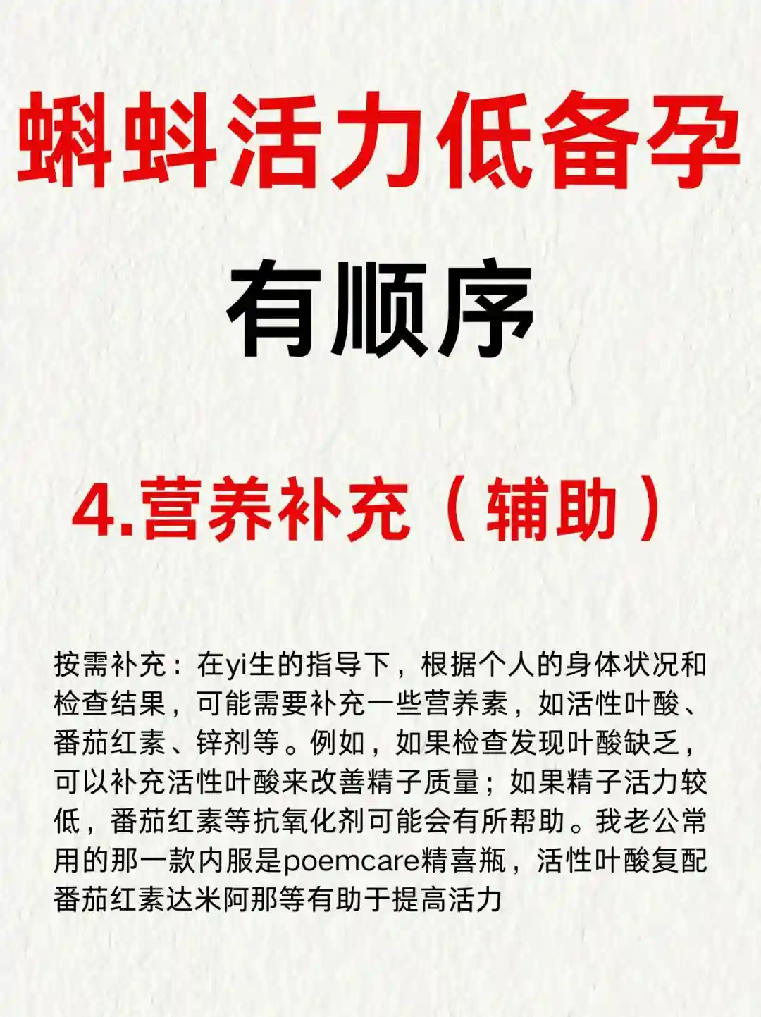 我老公常用的那一款内服是poemcare精喜瓶,活性叶酸复配番茄红素达米阿那等有助于提高活力,每天都有在坚持吃4粒, 大约三个月左右,蝌蚪数量多了质量也好,真的很激动,很开心