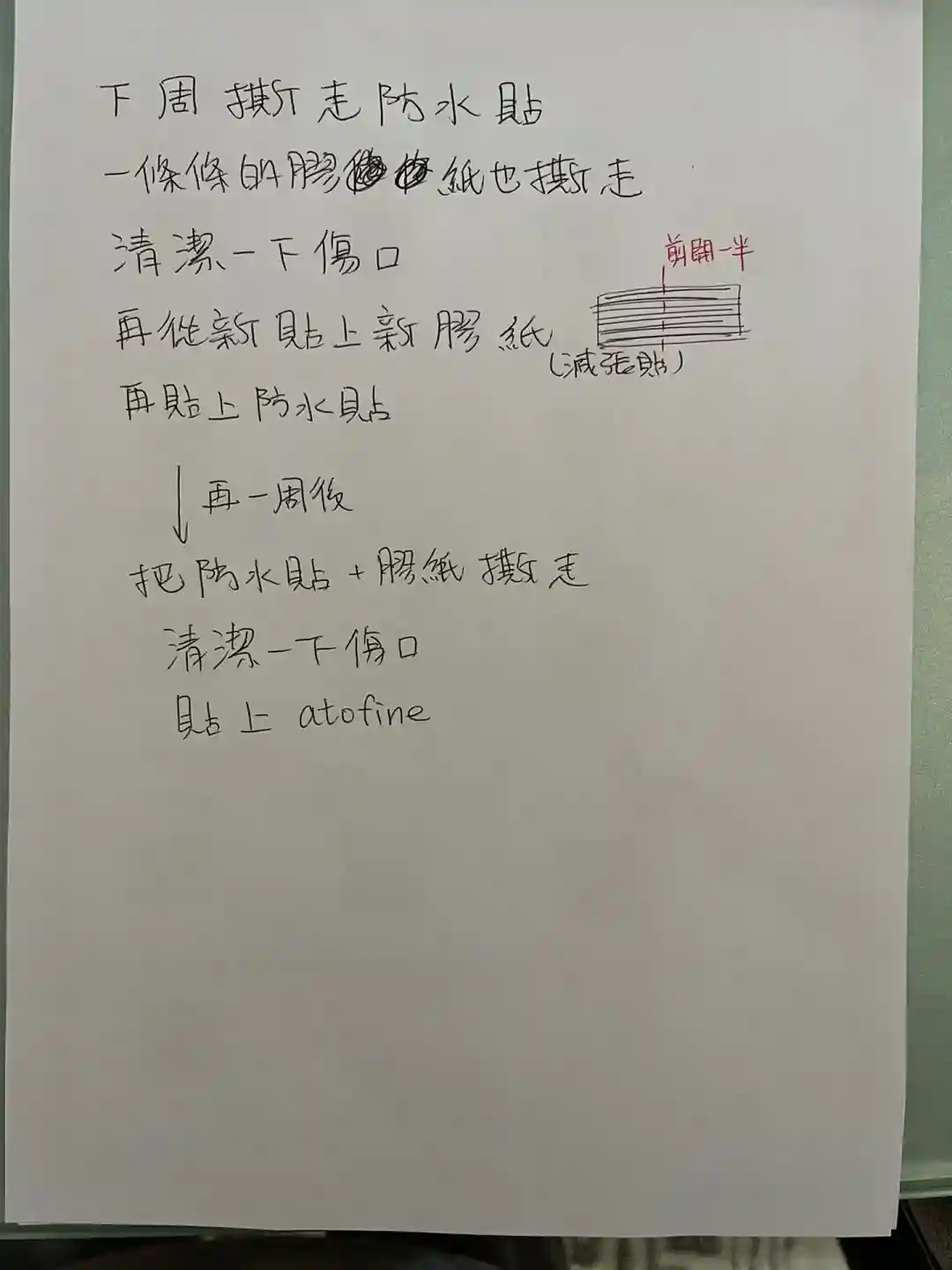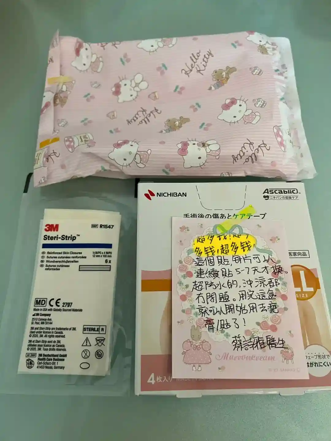 出院时蔡医生给写了中文出院小结,这个很重要,办理生育津贴时要用到。另外她还很贴心的手写了出院后伤口如何护理,药贴使用的步骤方法。事实证明很有必要,生娃后我脑子经常不够用,当时听蔡医生讲了,事后能记住的没几句。