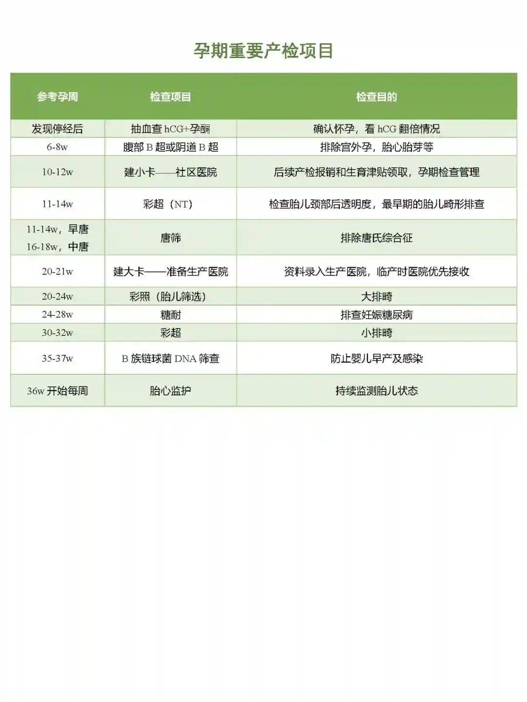 图2是几次重要产检的时间表。产检最好选在同一个医院,医生每次都会开好下一次的产检单,告知下次产检时间(产检项目都会安排在推荐的孕周内)