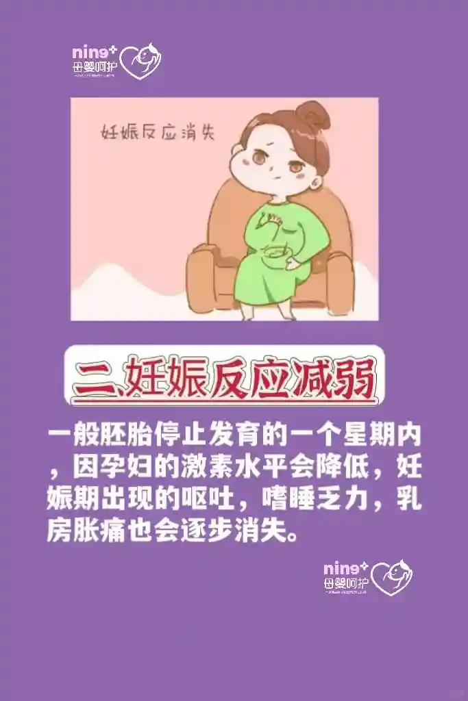 2、妊娠反应减弱:一般胚胎停止发育的一个星期内,因孕妇的激素水平会降低,妊娠期出现的呕吐,嗜睡乏力,乳房胀痛也会逐步消失。