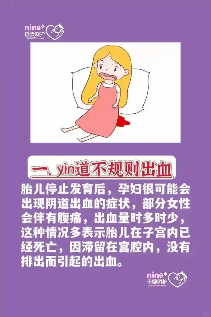 1、阴道不规则出血:胎儿停止发育后,孕妇很可能会出现阴道出血的症状,部分女性会伴有腹痛,出血量时多时少,这种情况多表示胎儿在子宫内已经死亡,因滞留在宫腔内,没有排出而引起的出血。