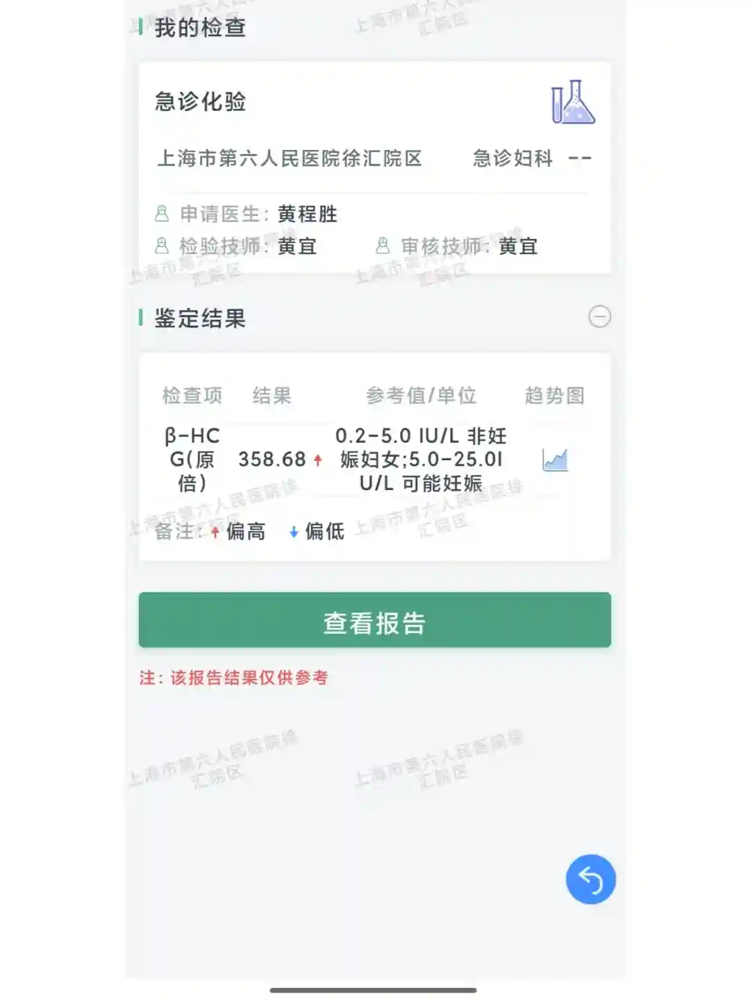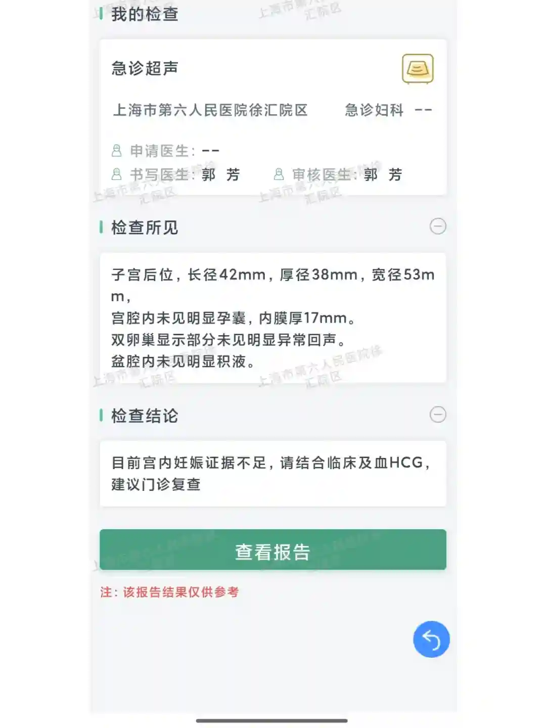 结果11月初,一个周五晚上,本来一家人还在饭店吃饭,结果在卫生间发现流血(当天可能也是走路走的有点多),赶紧去了附近的六院急诊,结果出来很不好,医生说是先兆流产,做了B超看不见孕囊,晚上没有阴超,建议我住院观察,第二天一早做阴超确诊。但是我当时肚子不痛,且血流的不多就先回家了