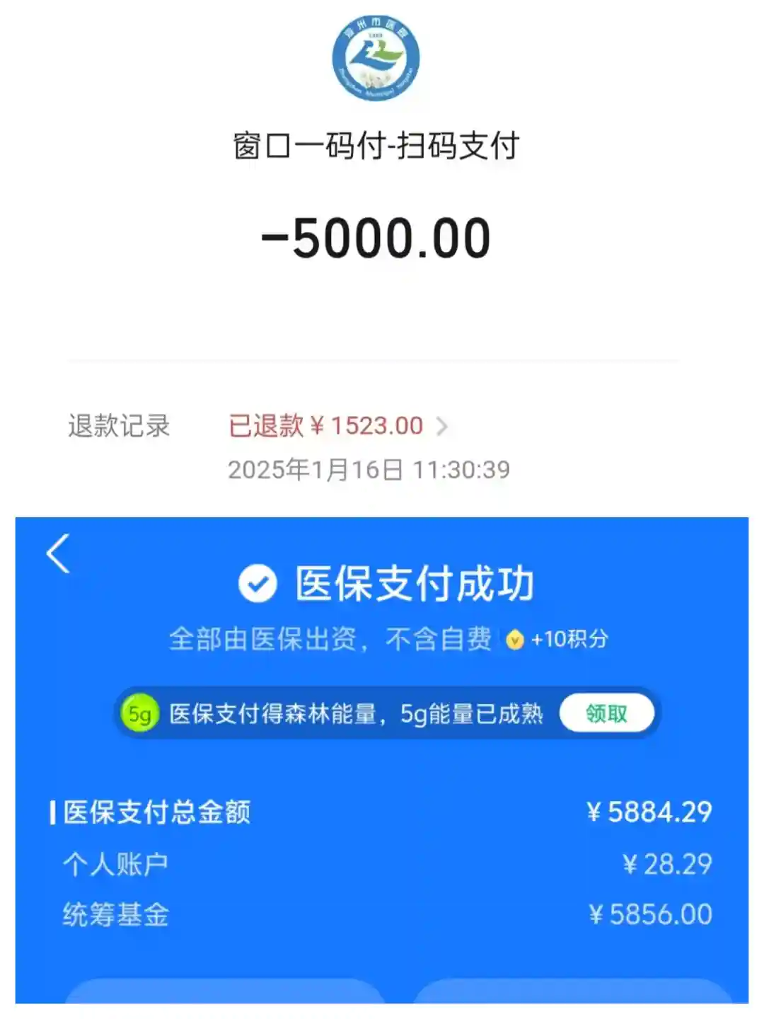 住院预缴交5000,结算退回1532,职工医保报销5884.29,个人账户扣款28.29,总费用9361.29,扣除医保总自费💰3505.29