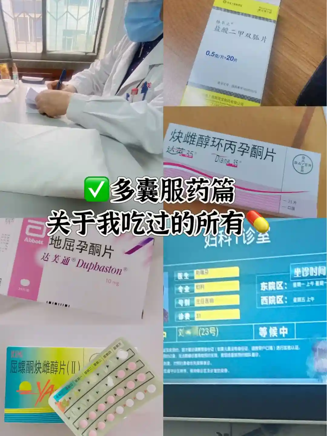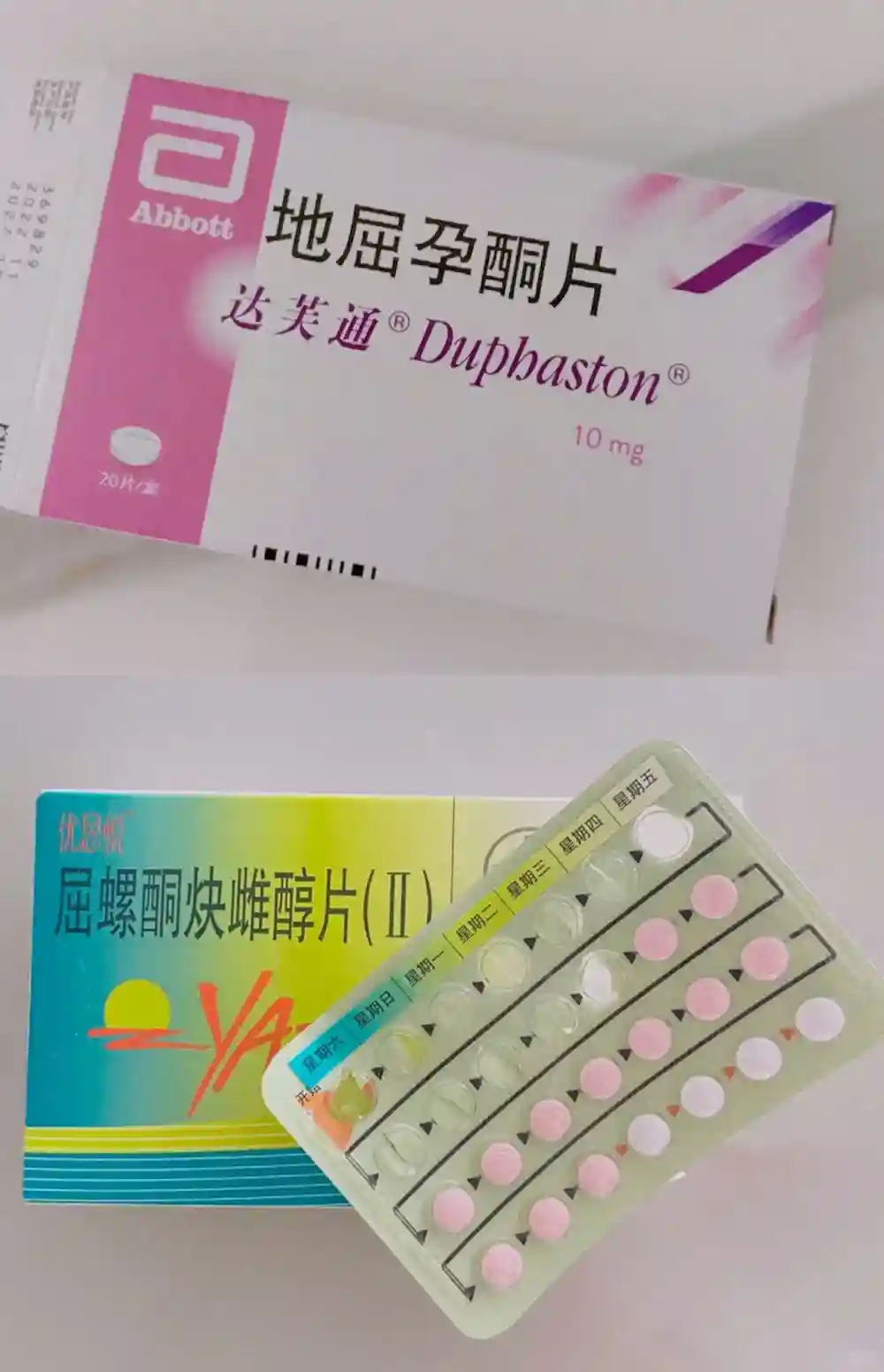 1️⃣最开始吃了十天达芙通后来了姨妈,月经第五天开始吃优思悦,吃了三个周期去医院查内膜还是不够,于是有喜提两个周期。期间二甲和中药是一直吃的。